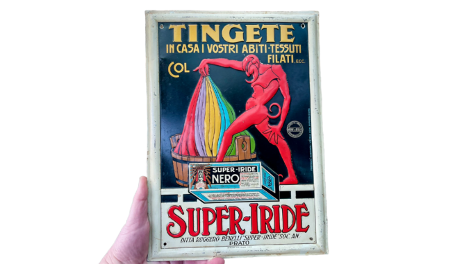 Ein italienisches Blechschild als eindrucksvolles Beispiel früher Industrie- und Werbegrafik. Markante Symbolik und hochwertige Ausführung machen es zu einem besonderen Zeitzeugen der italienischen Textil- und Werbegeschichte. Ein herrliches Motivschild aus geprägtem und lithografierten Blech (Bilder: Sammler.Net) Ein italienisches Werbeschild für Super-Iride Textilfarben um 1915 als ... weiterlesen