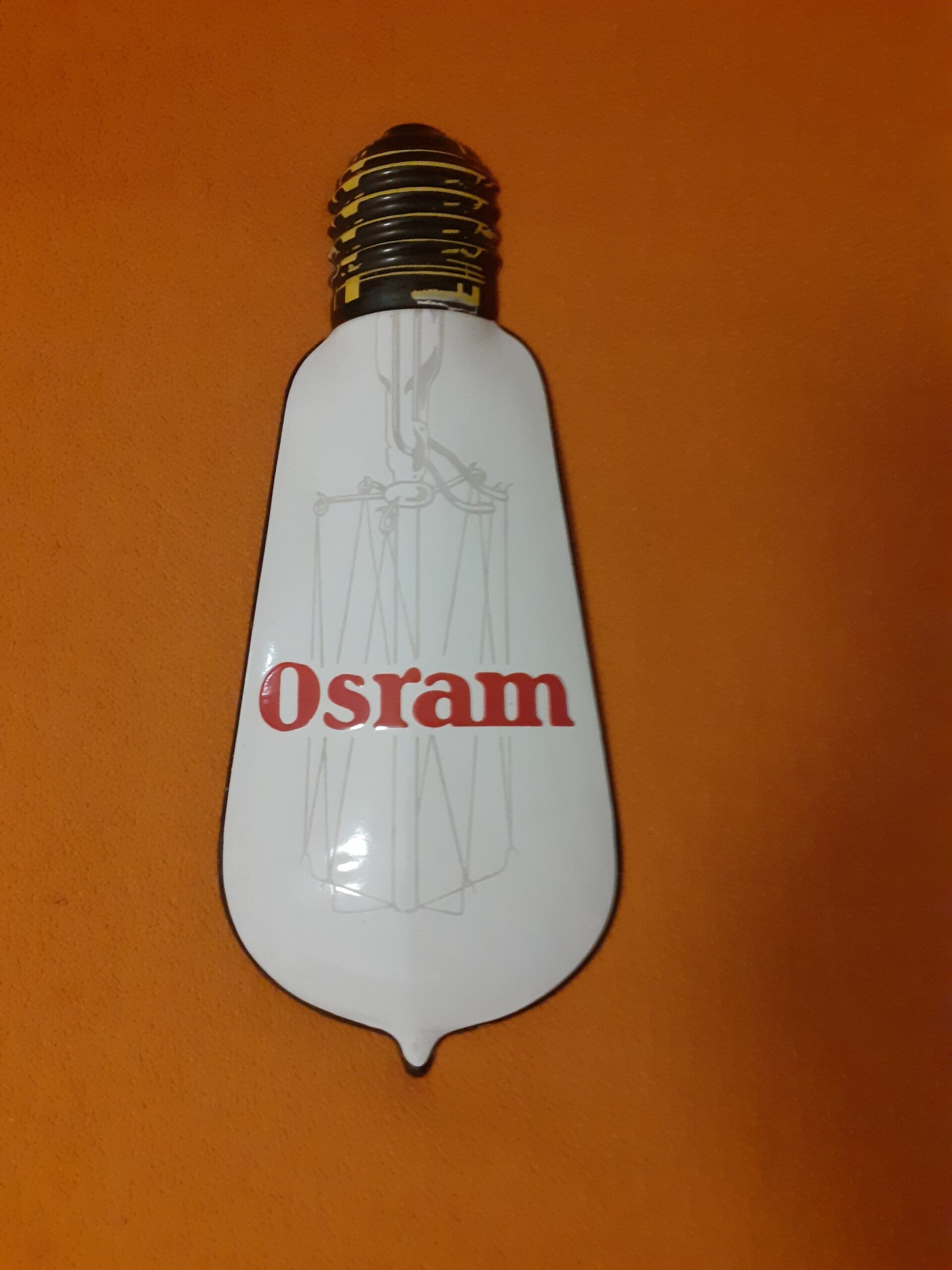 Es gab an den Fassaden von Ladengeschäften, in denen man die Produkte erwerben konnte, solche Osram-Emailschilder, die ganz einfach gestaltet aber doch sehr effektiv waren. Ein Oval, mit kräftigem orangefarbenen Hintergrund, manchmal mit weißer Randlinierung, oder bei den ganz frühen ockergelb umrahmt, ganz oben der Schriftzug OSRAM in kapitalen Lettern.