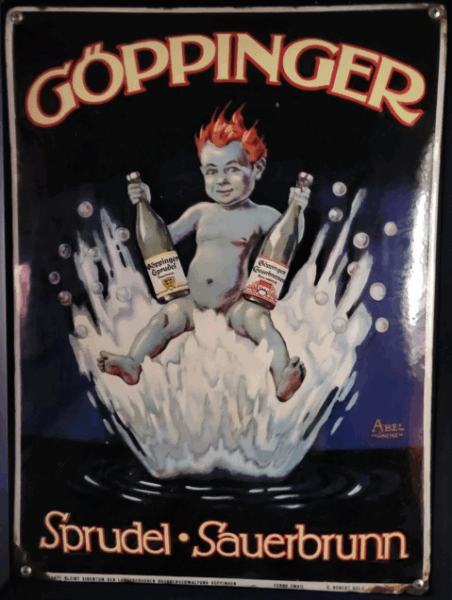An diesem Emailschild scheiden sich die Geister: Die einen finden es gruselig, für die anderen stellt es einen der spannendsten und beliebtesten Entwürfe deutscher Reklameschilder statt. Fest steht auf jeden Fall: Das Schild, mit dem für das Göppinger Nass geworben wird, fällt an jeder Mauer auf.