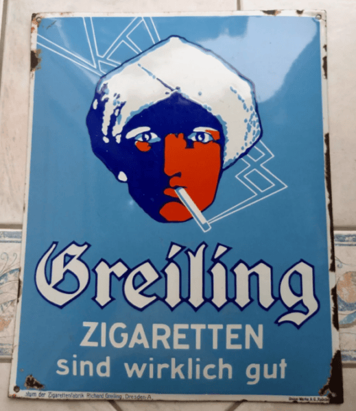 In dieser Ausführung mit dem Text “Greiling Zigaretten sind wirklich gut” ist dieses Emailschild nicht oft zu finden. Die mit ca. 40 x 50 cm kleinere und seltenere Version des 1920er-Jahre-Klassikers mit dem beliebten Turbanträger verfügt über einen sehr schönen Glanz.
