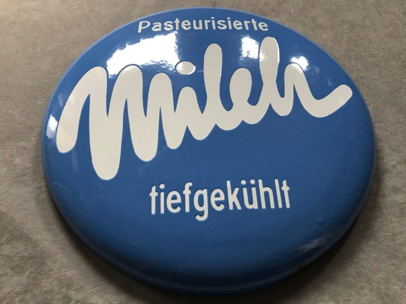 Bis zum 1. April 2023 um 19:34 Uhr im Angebot: Original Emailschild, Button, Reklame für tiefgekühlte, pasteurisierte Milch aus dem Emaillierwerk Mellendorf/Hannover. 1950er Jahre. Das Schild befindet sich in sehr gutem Zustand!