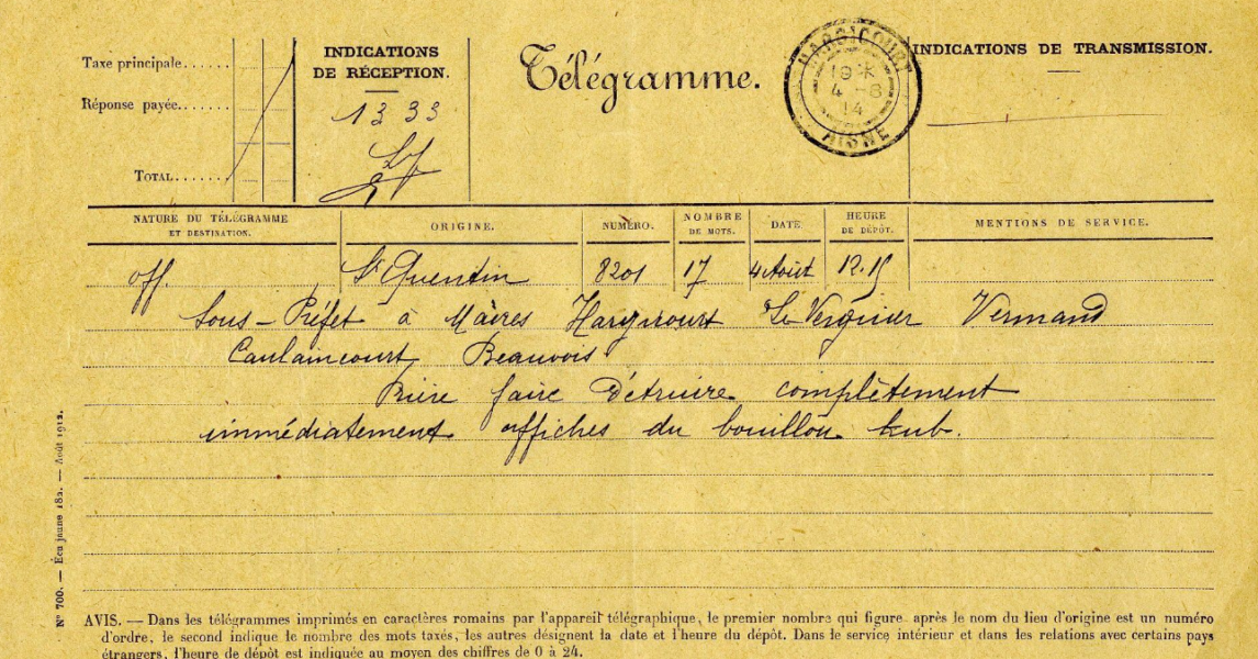 “Prière faire Détruire complètement immédiatement affiches du bouillon kub.” kann man auf obigem Telegramm lesen. Übersetzt heißt das: “Bitte vernichten Sie sämtliche Kub-Bouillon-Plakate unverzüglich.”