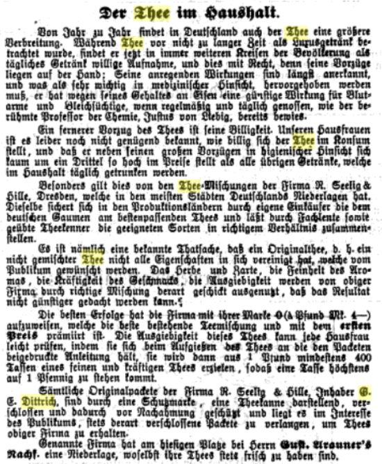 Schon bald nahm er aber auch erste Teesorten ins Angebot. Diese erfreuten sich einer großen und wachsenden Beliebtheit und aus dem Geschäft für „Japan- und Chinawaren“, das in der Pragerstraße auf Nummer 30 angesiedelt war, entwickelte sich so innerhalb weniger Jahrzehnte ein bis heute international operierender Tee-Anbieter.