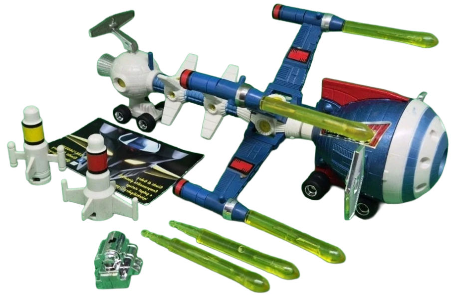Gelbe Steck-Projektile, die sogenannten Protonen-Raketen, dominieren die Frontpartie – ein klares Zugeständnis an die damalige Erwartungshaltung: Ein Raumschiff musste „schießen“ können.