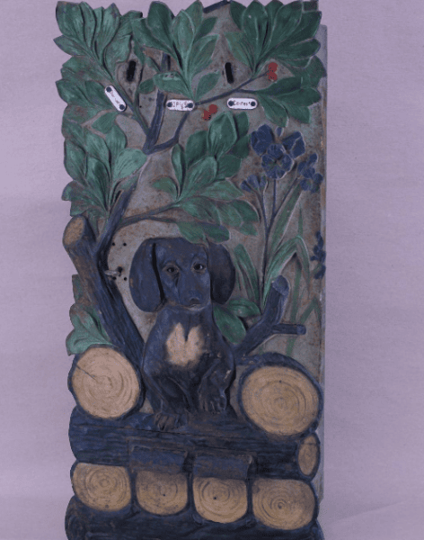 Fünftes Objekt der Reihe der mit Schätzpreisen von mindestens 50.000€ bedachten Lose war ein antiker Warenautomat. Im Katalog als “Schokoladenautomat Hund” bezeichnet, “Blechkorpus mit gusseisener Front, diese zeigt einen Dackel mit Glasaugen im Wald”.