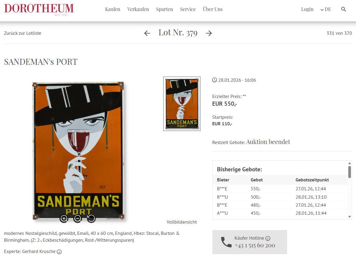 Dorotheum: Sandeman-Emailschild, krasse Fälschung in Plakat & Reklame-Auktion 550€ für ein rezentes Fake! Kein „Nostalgieschild“, wie der Experte schreibt – das heißt ganz kla...- 1