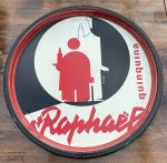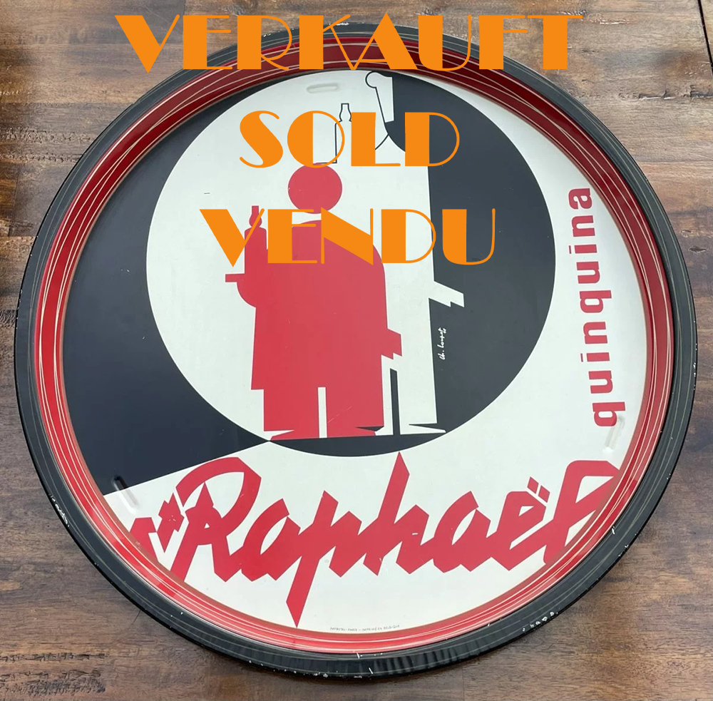 Sehr gut erhaltenes, wohl nie benutztes original Blech-Serviertablett aus den 1940er Jahren mit Reklame für den Aperitif St. Raphaël (Quinquina). Minimale Altersspuren. In diesem feinen Zustand sehr selten!