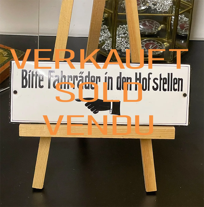 Extrem seltene Emaille-Arbeit: nicht umgedruckt, nicht schabloniert sondern per Hand gemalt. “Bitte Fahrräder in den Hof stellen” kann man lesen, darunter eine nach links zeigende Hand.