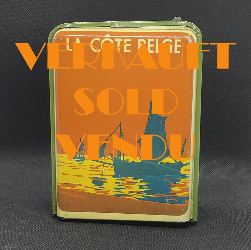 “La Côte Belge” und “Les Ardennes Belges” – Seltene, alte mechanische Spardose aus Blech