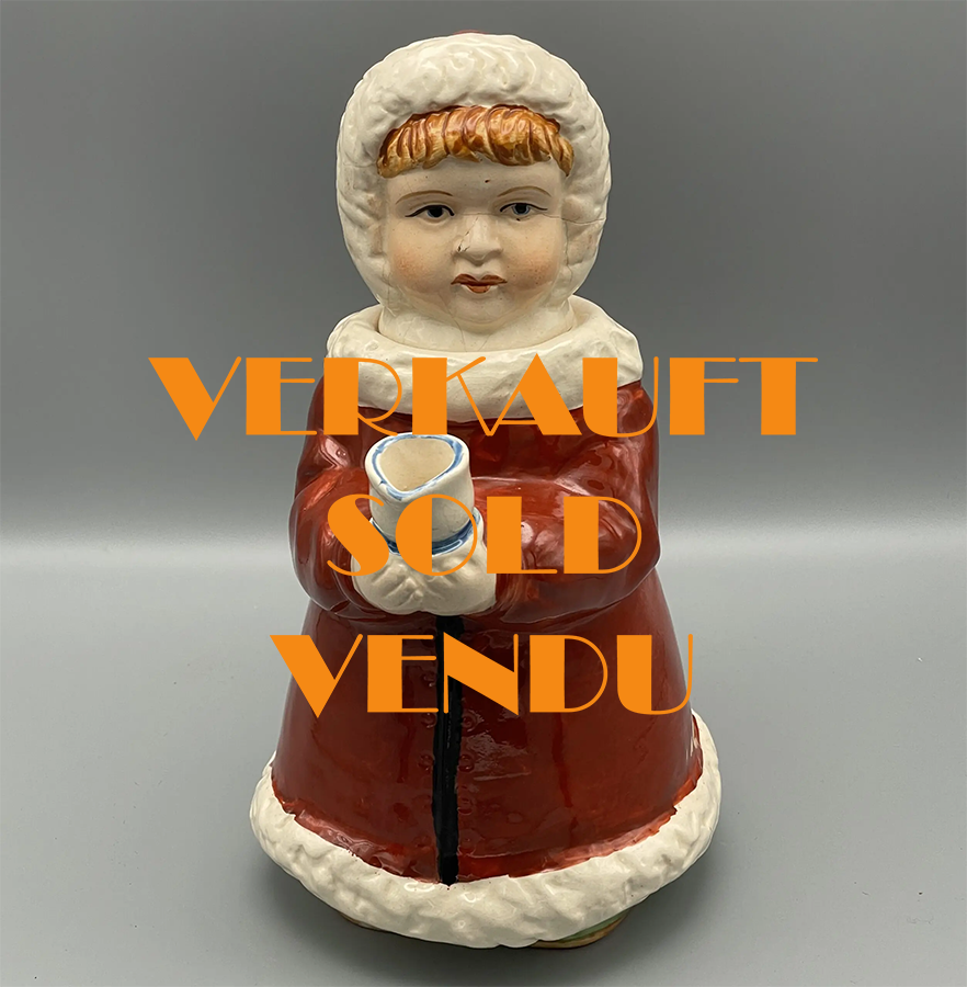 Schöne, alte Kakao- oder Tee-Kanne mir unbekannter Manufaktur. Erinnert an die Berger-Kakao-Kanne mit dem Suchodolski-Kind. Ist aber keine Werbefigur, sondern ein dekorativer Gebrauchsartikel. Höhe ca. 25 cm.
