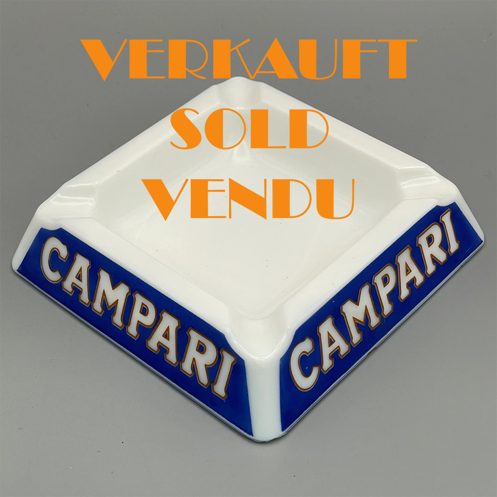 Sehr schön erhaltener, französischer Opalglas-Ascher mit aufgedruckter Reklame für den italienischen Aperitif Campari. Ca. 12 cm Seitenlänge. Siehe Bilder!