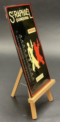 Seltenes Reklame-Blechschild mit Thermometer aus der Zeit um 1940-50, mit den beiden Kellnern von Charles Loupot hier in einer anderen Variante. Siehe auch: https://sammler.net/alte-reklame/emailschilder/st-raphael-himmlische-geschichte-eines-franzoesischen-aperitifs/