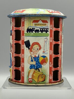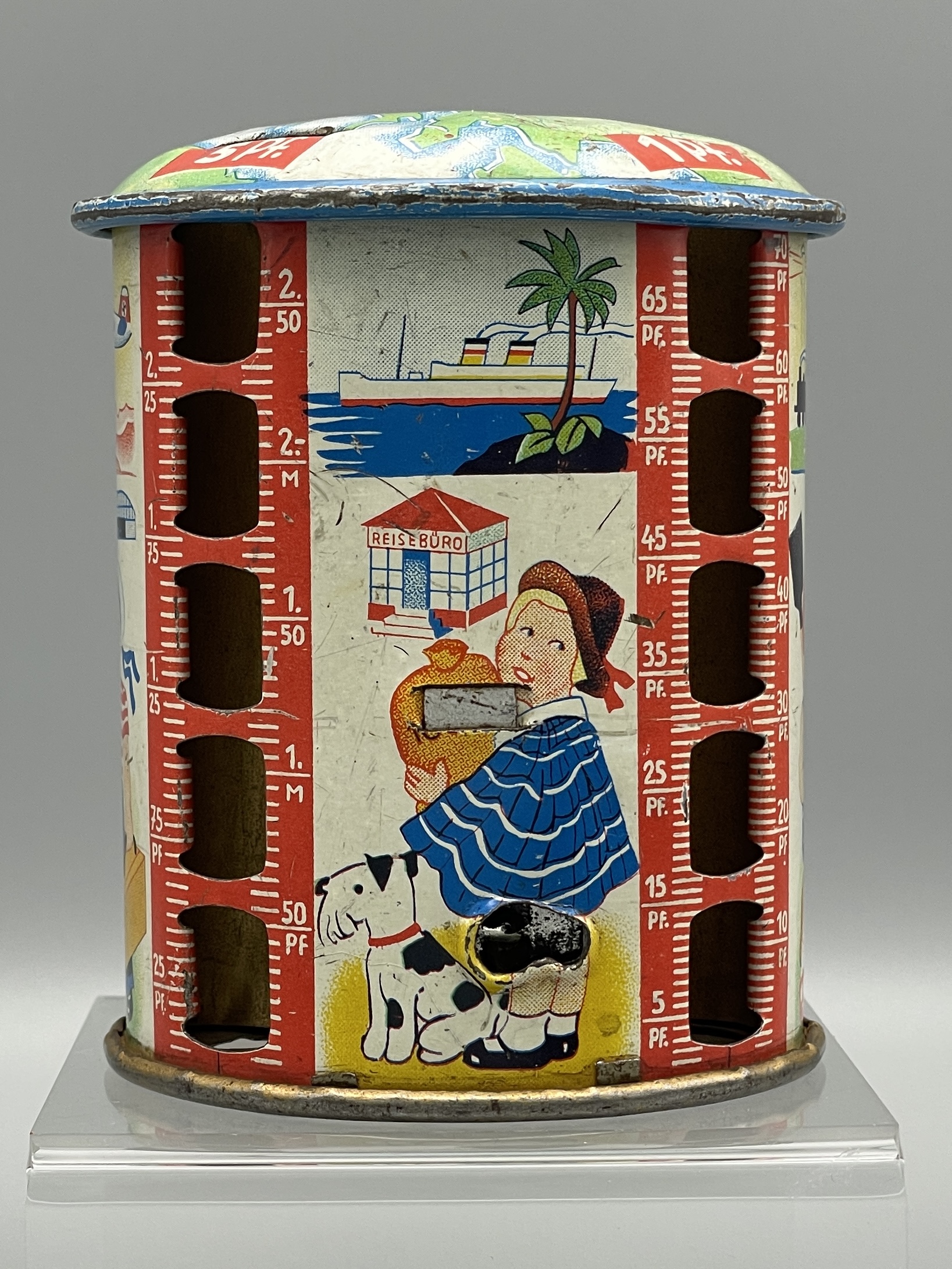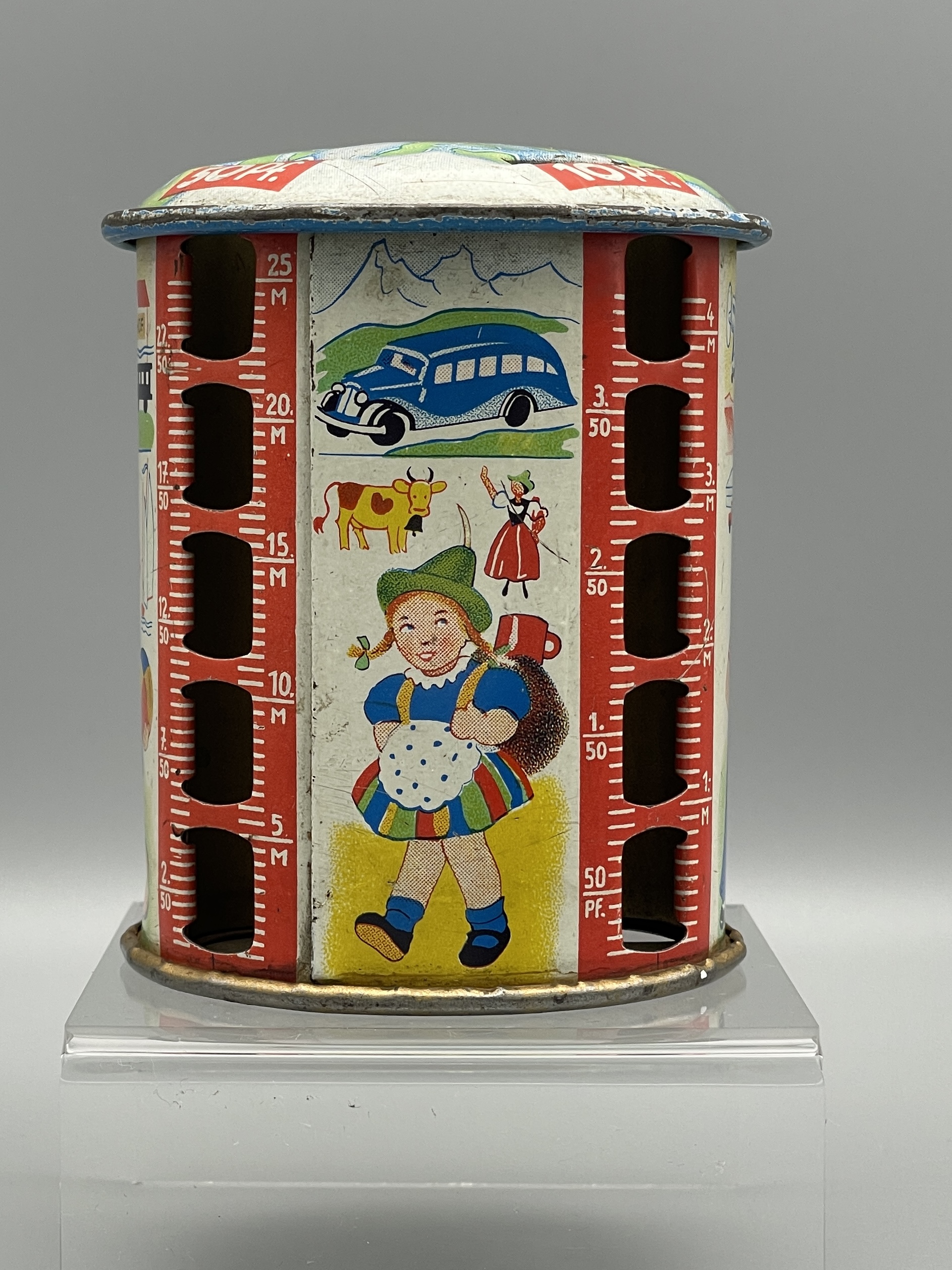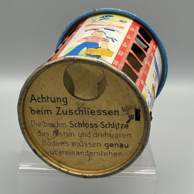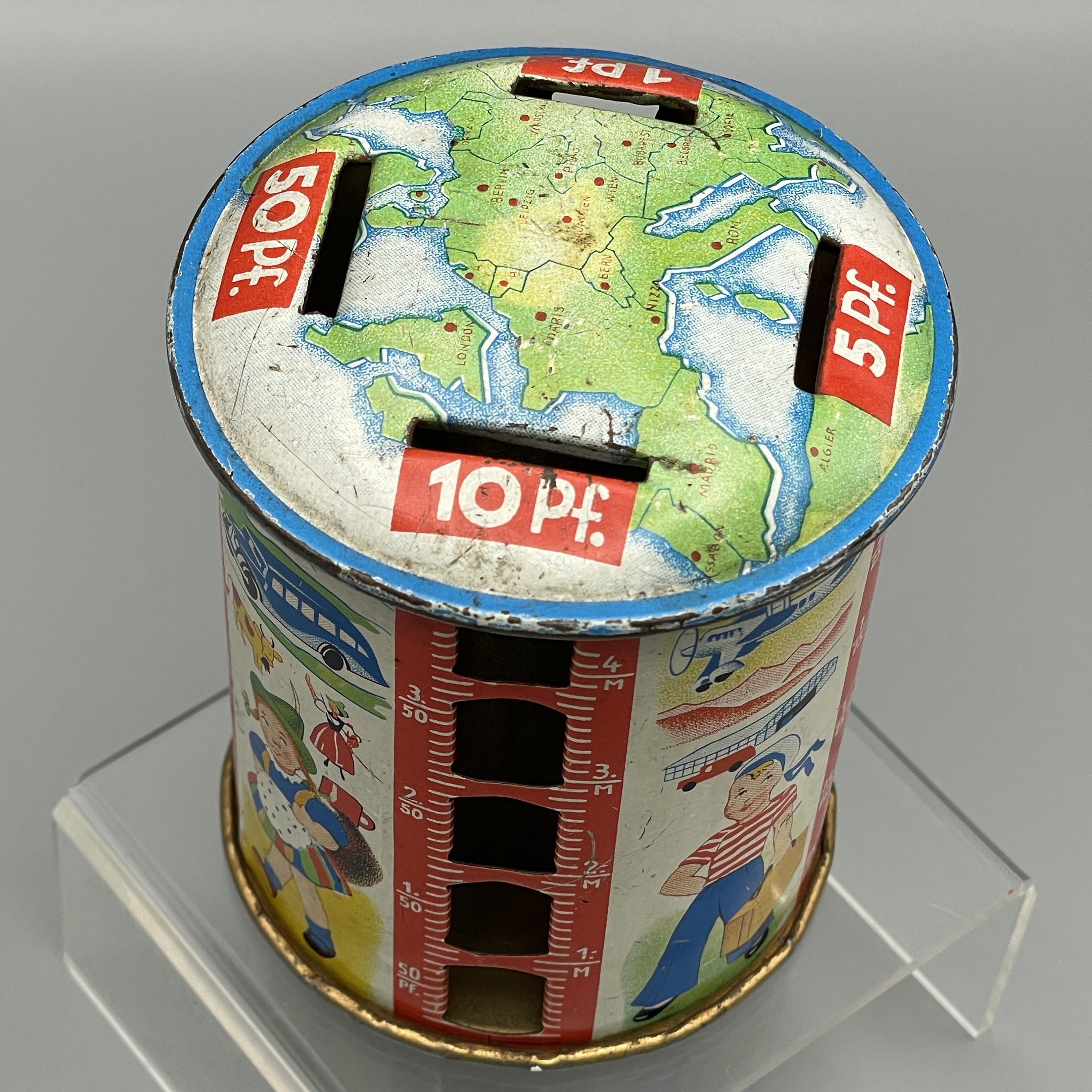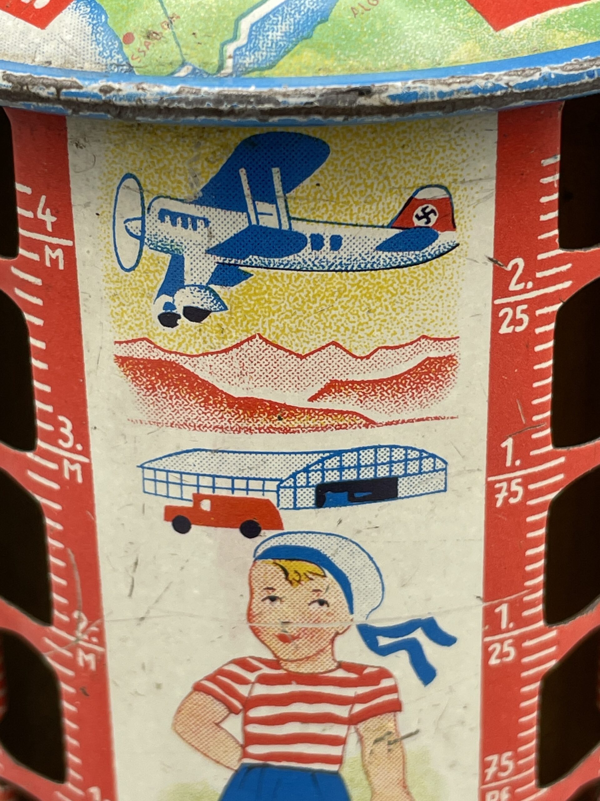 Seltene Spardose aus Blech aus den 1930er Jahren. Man beachte das Flugzeug, das noch eine nationalsozialistische Flagge am Ruder trägt!