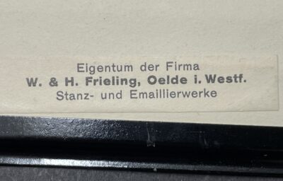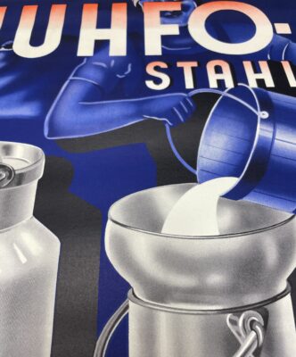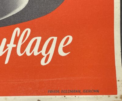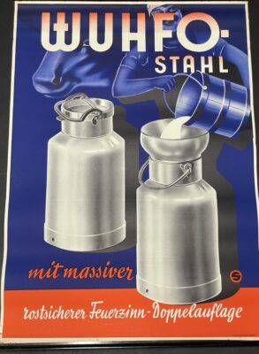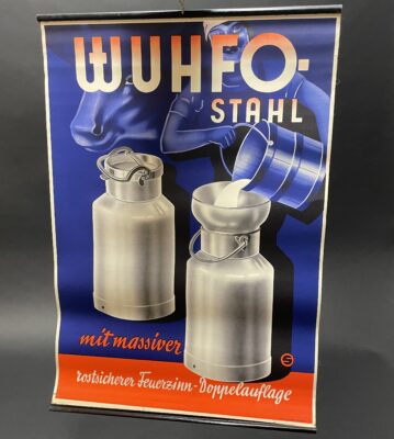 Original-Plakat, lithografiert, Grafik im Bauhaus-Stil, wohl 1930er Jahre. Reklame für die Stahlprodukte der Marke WUHFO. Plakat auf Vorderseite unten am Rand markiert “Friedr. Dossmann, Iserlohn”. Rückseitig Etikett “Eigentum der Firma R. & H. Frieling, Oelde i. Westf., Stanz- und Emaillierwerke”.