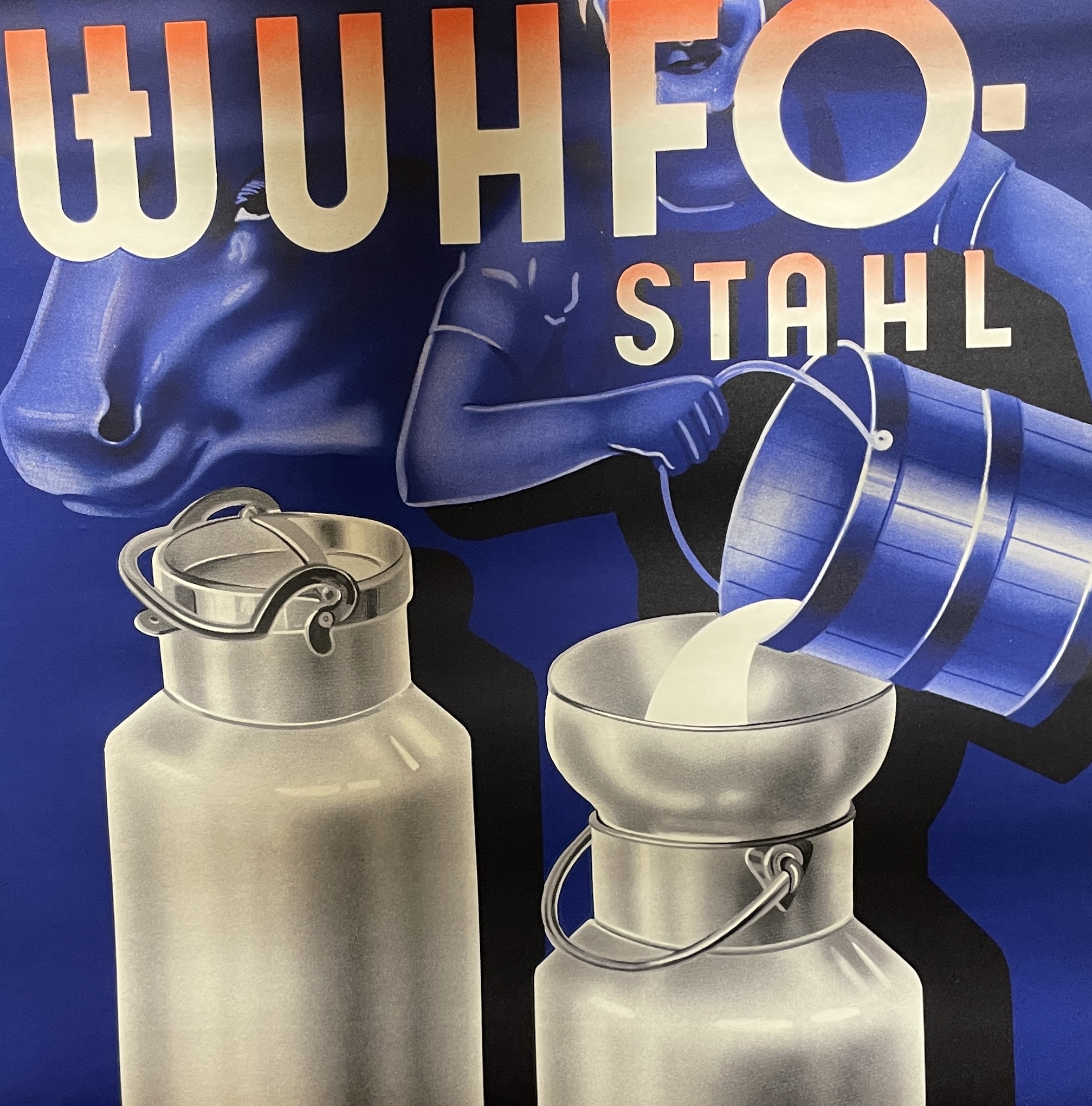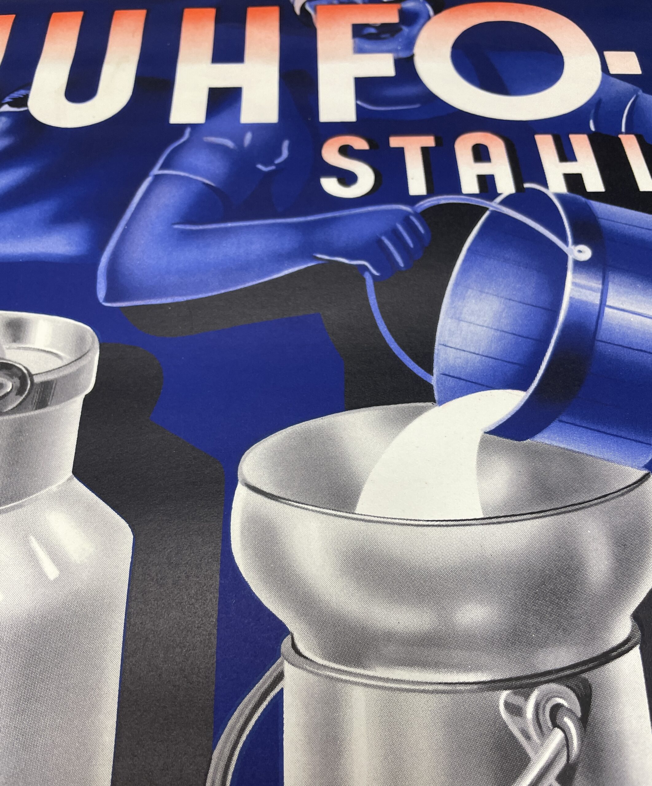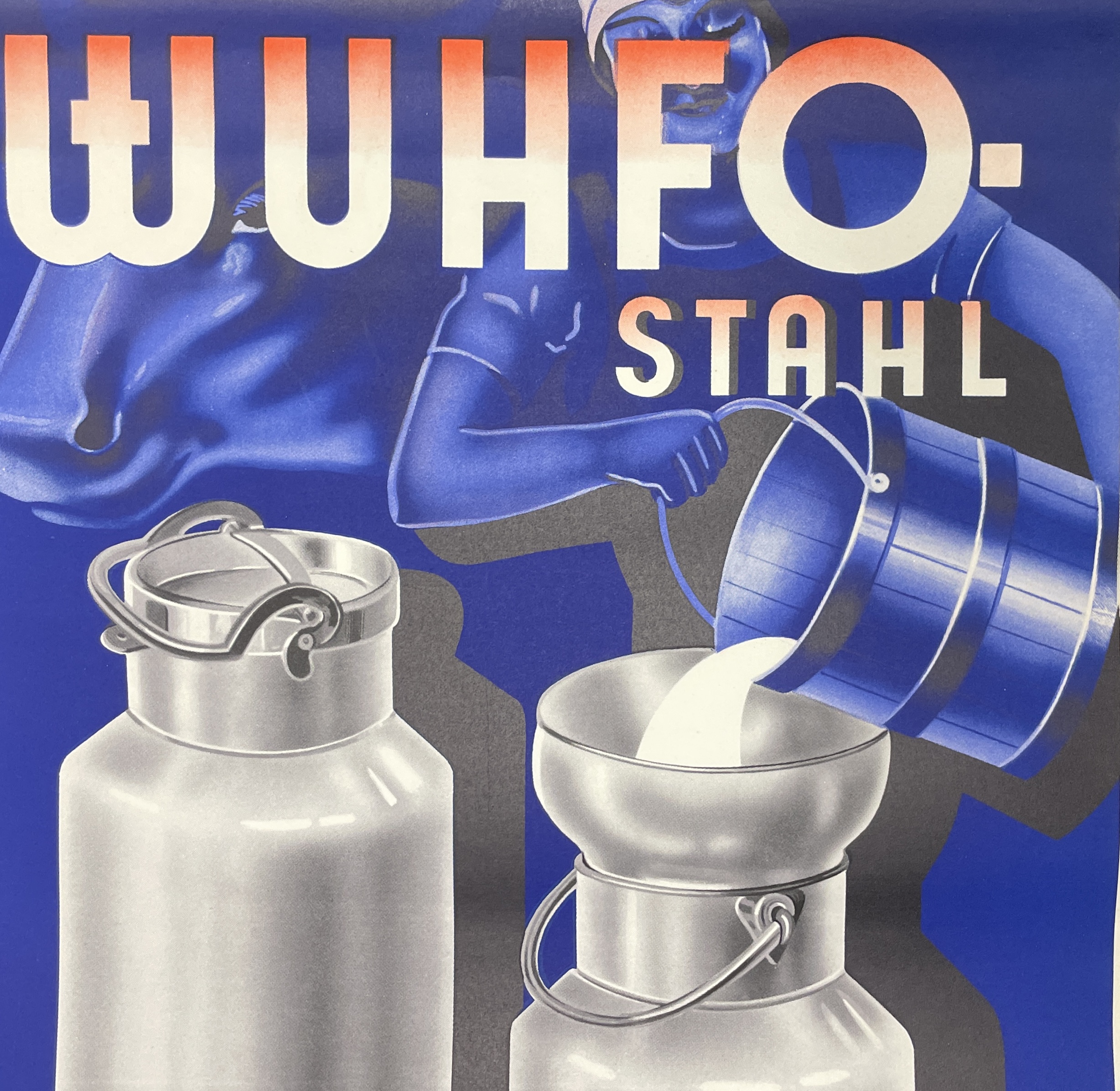 Original-Plakat, lithografiert, Grafik im Bauhaus-Stil, wohl 1930er Jahre. Reklame für die Stahlprodukte der Marke WUHFO. Plakat auf Vorderseite unten am Rand markiert “Friedr. Dossmann, Iserlohn”. Rückseitig Etikett “Eigentum der Firma R. & H. Frieling, Oelde i. Westf., Stanz- und Emaillierwerke”.