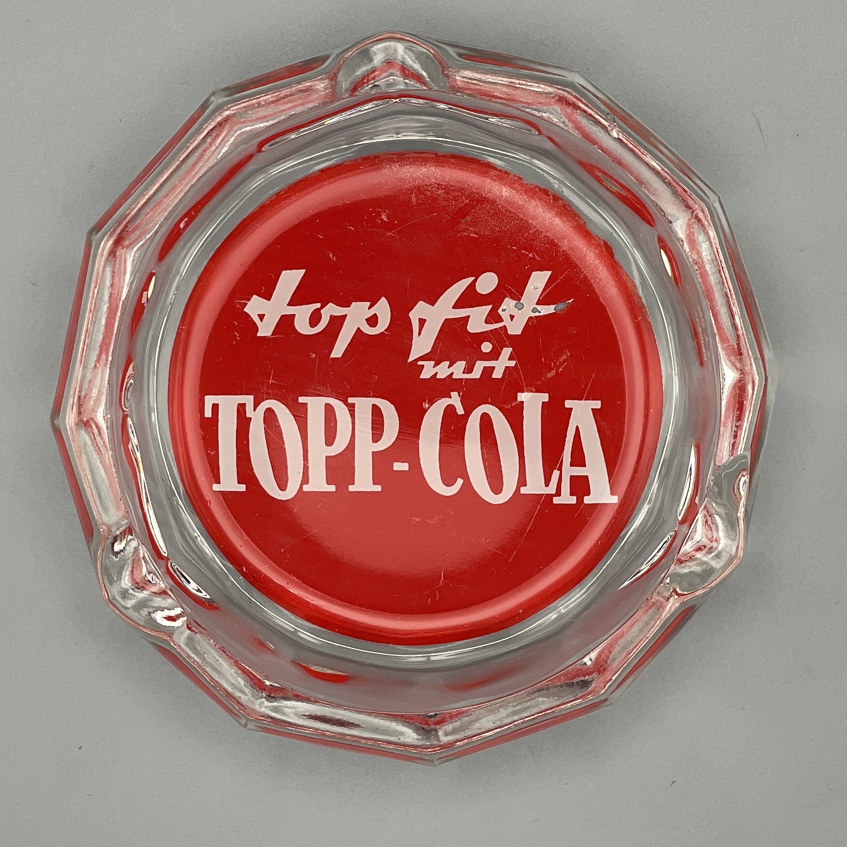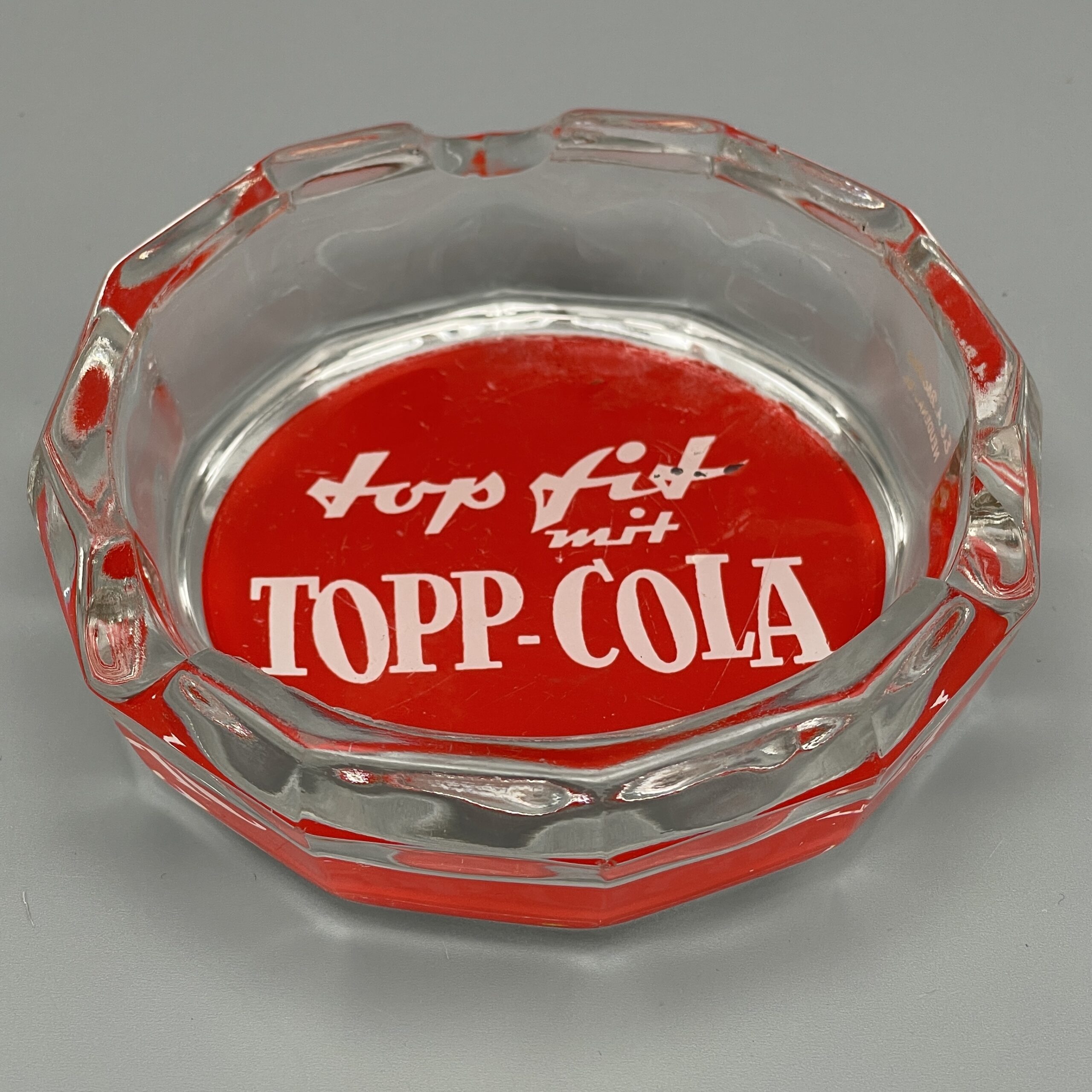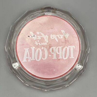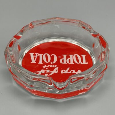 Glas-Aschenteller mit Reklame für die Getränkemarke TOPP-COLA aus den 1960er Jahren. Hergestellt und vertrieben wurde das Getränk durch die Tropi GmbH in Dortmund, die von 1962 bis 1968 bestand.