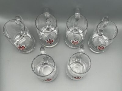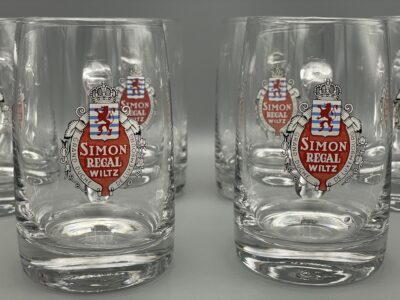 Konvolut aus sechs ca. 11,5 cm hohen Bierkrügen (“Klenschen”) der Brauerei Simon aus Wiltz (Luxemburg), aus den 1960er Jahren. Reklame für die Biermarke “Simon Regal”. Ein Glas hat einen Riss am Henkel, der von vorne nicht sichtbar ist. Siehe Bilder!