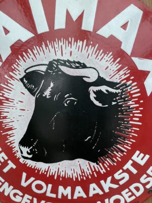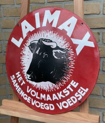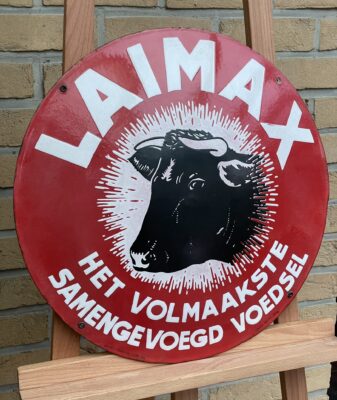 Sehr seltenes Emailschild aus dem landwirtschaftlichen Bereich mit Reklame für das Viehfutter der Marke LAIMAX. Das Beste von nur drei bekannten Exemplaren.