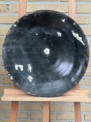 Das Schild ist stark gewölbt mit einem leicht flach auslaufenden Rand. Es ist dick schabloniert, hergestellt im Jahr 1929 bei L’Émail Belge, Brux. Der Durchmesser beträgt ca. 50 cm.