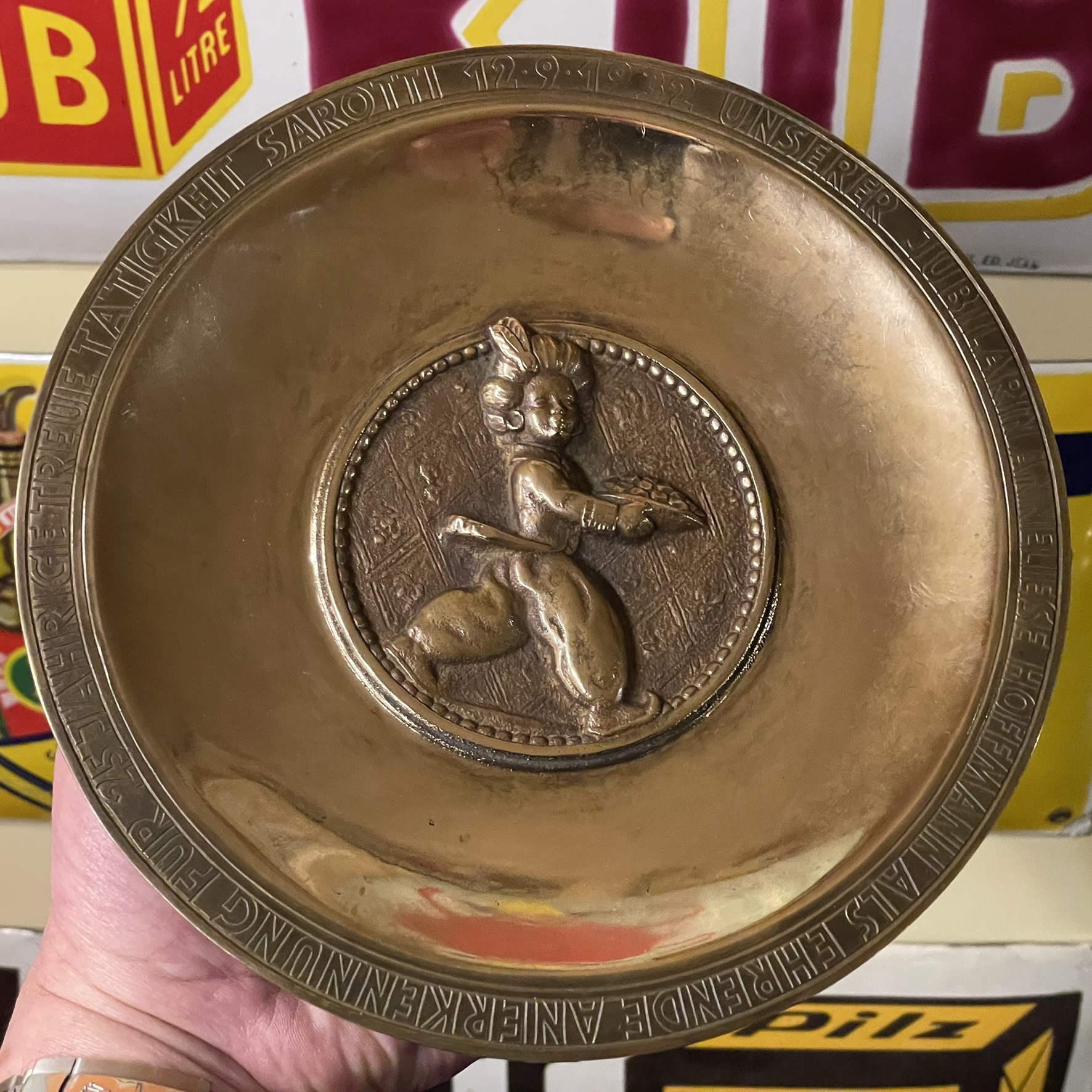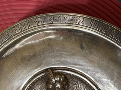Original-Jubiläumsteller aus Bronze von Sarotti aus dem Jahr 1932, überreicht für 25-jährige Dienste an die Mitarbeiterin Anneliese Hoffmann, wie aus der Randgravur hervorgeht.