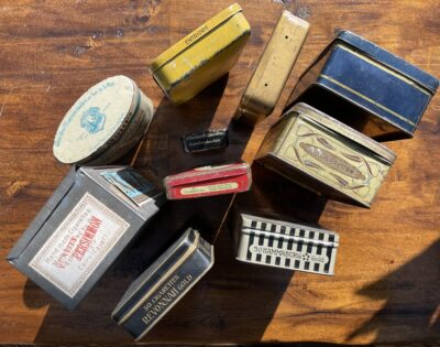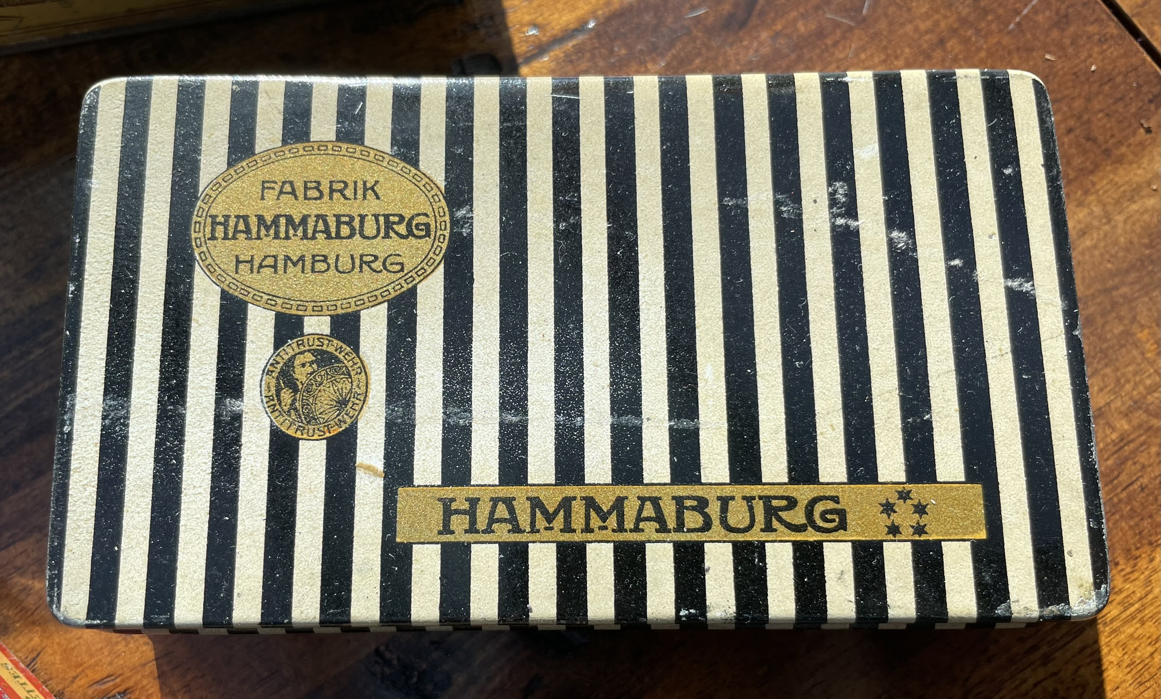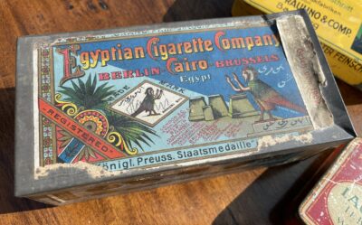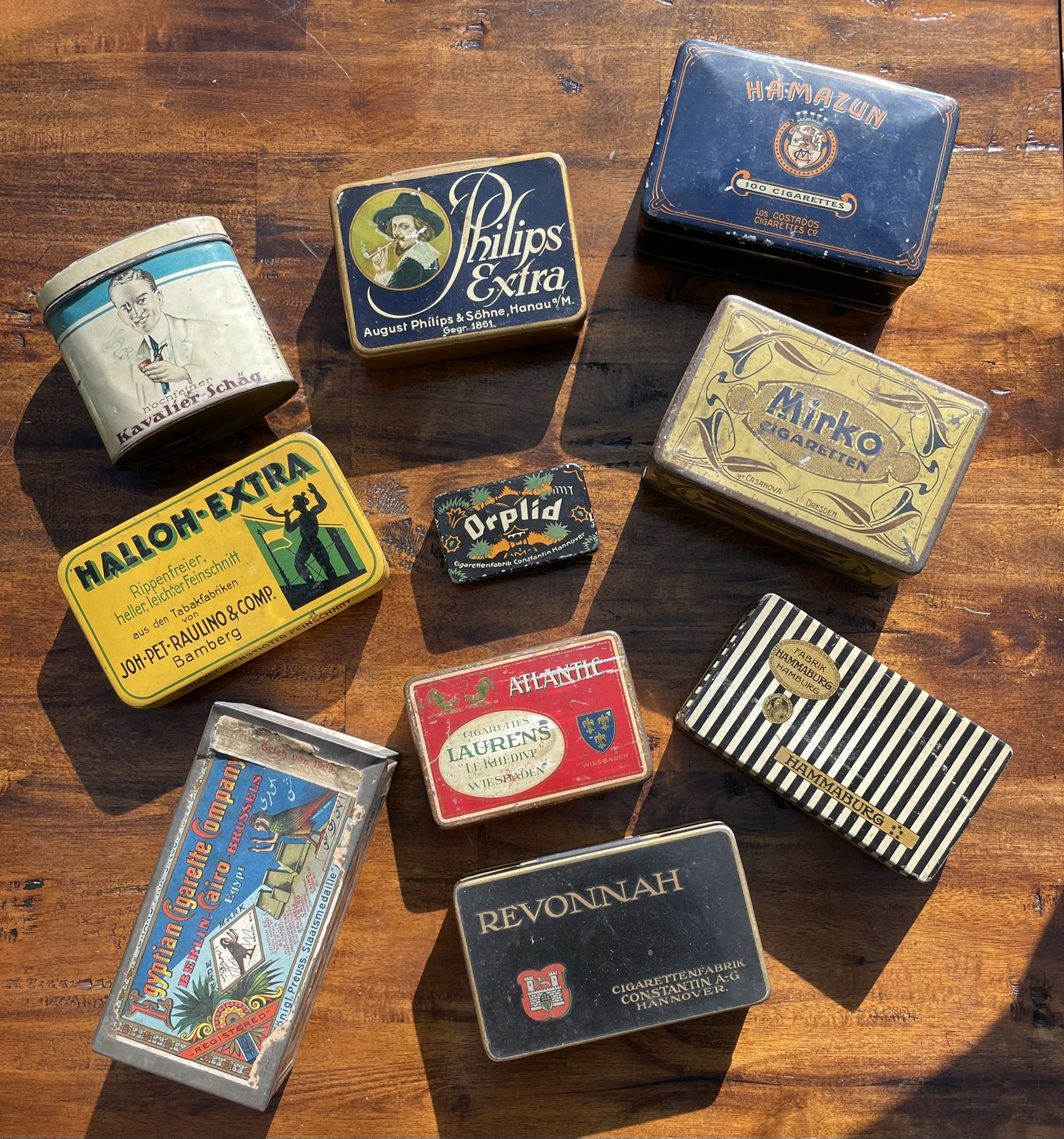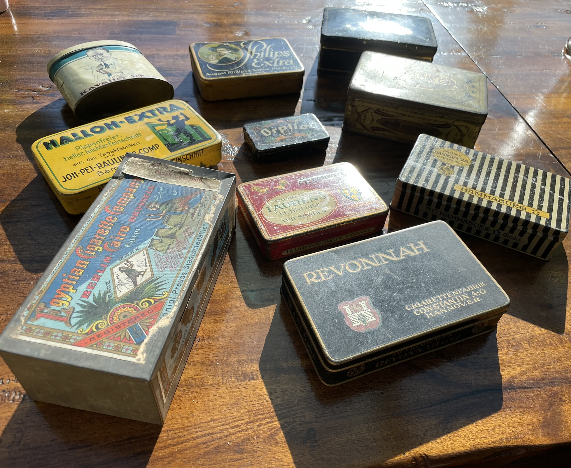 Konvolut aus 10 zum Teil seltenen Tabak- und Zigarettendosen: Mirko (Casanova),Revonnah (Constantin Hannover), Hammaburg, Laurens Atlantic, Egyptian Cigarette Company, Halloh-Extra, Orplid, Hamazun, Philips Extra, Kavalier Schäg.