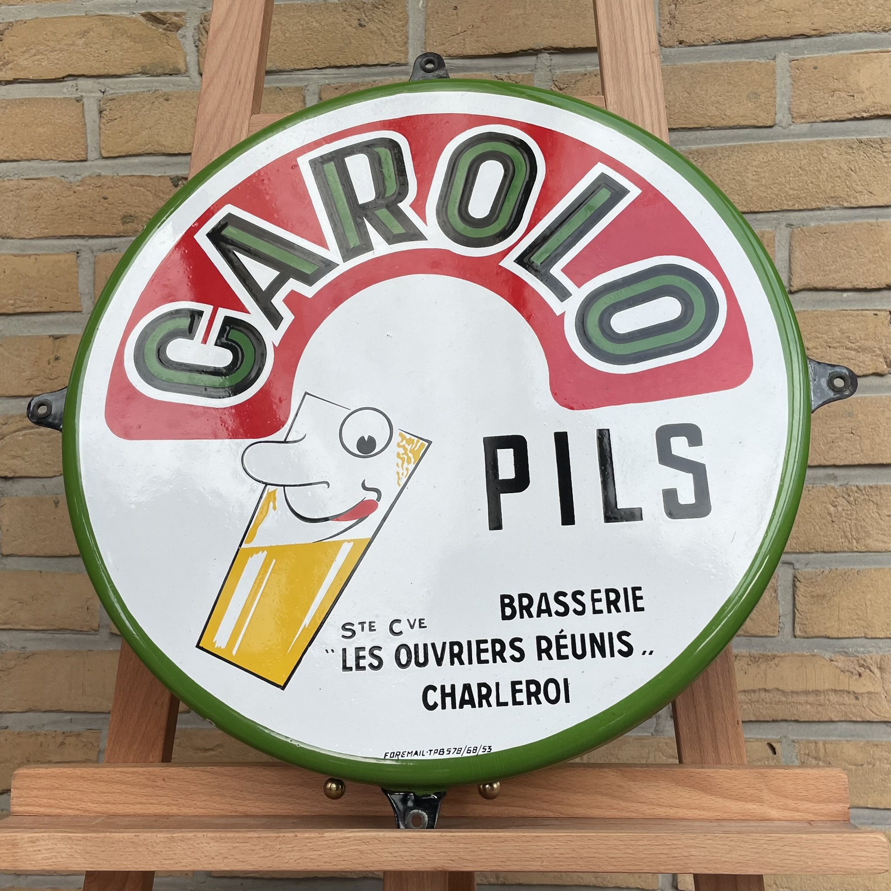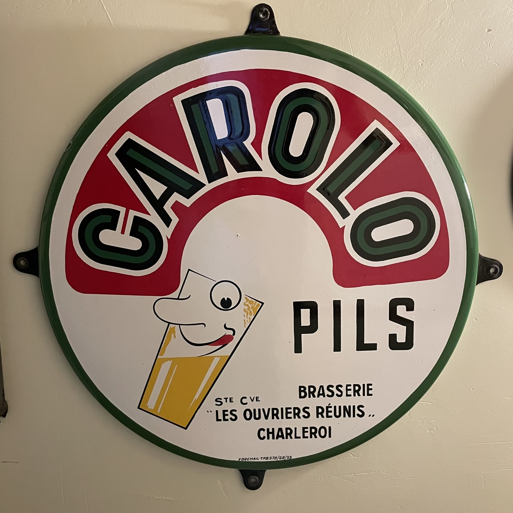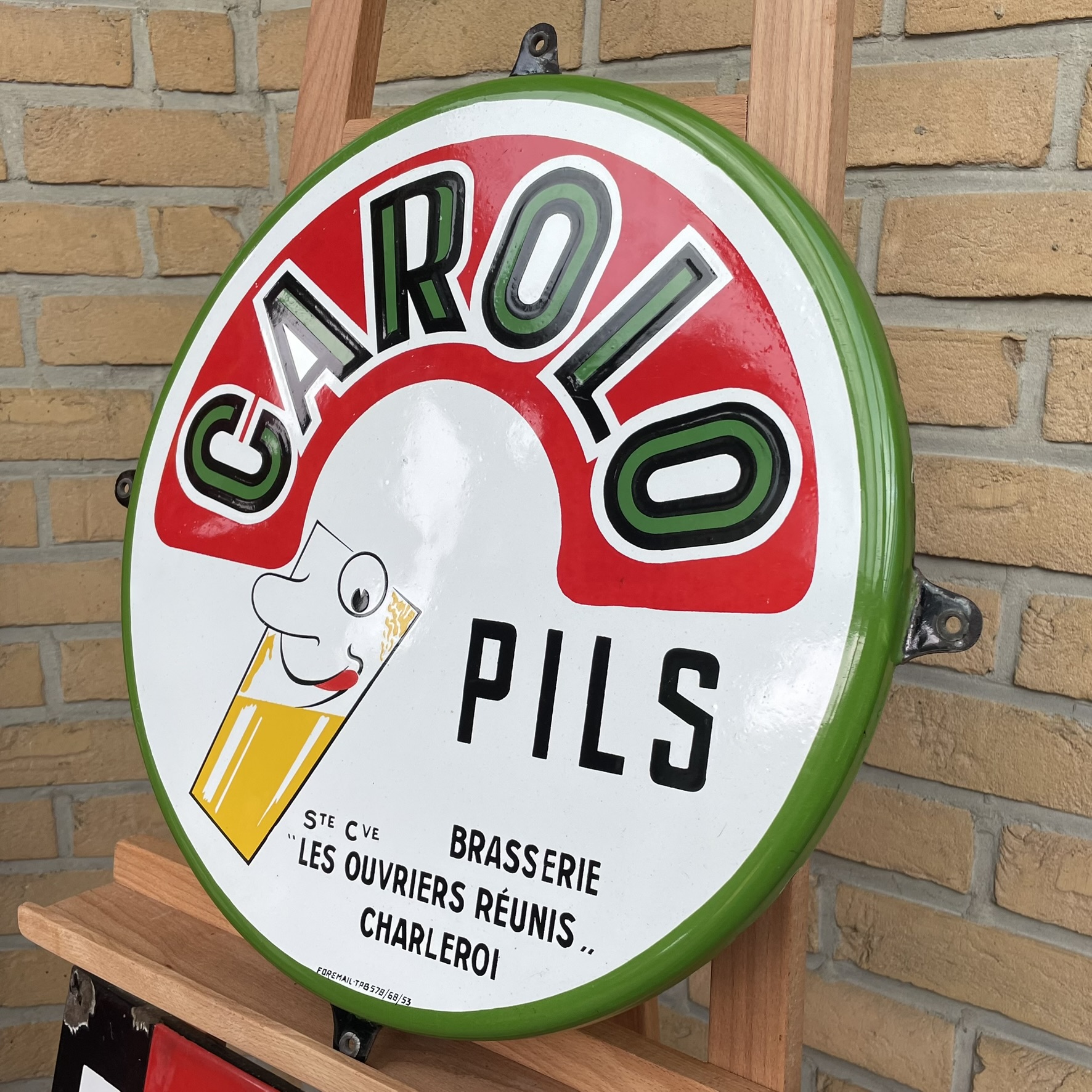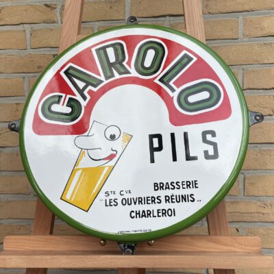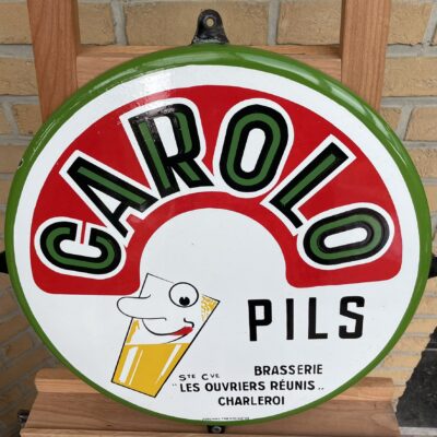 Sehr seltenes, witziges Brauereischild / Bierschild aus Belgien von 1953. Geworben wird für das Pils der Marke CAROLO aus Charleroi. Carolo ist übrigens der Spitzname der Bewohner dieser Stadt.