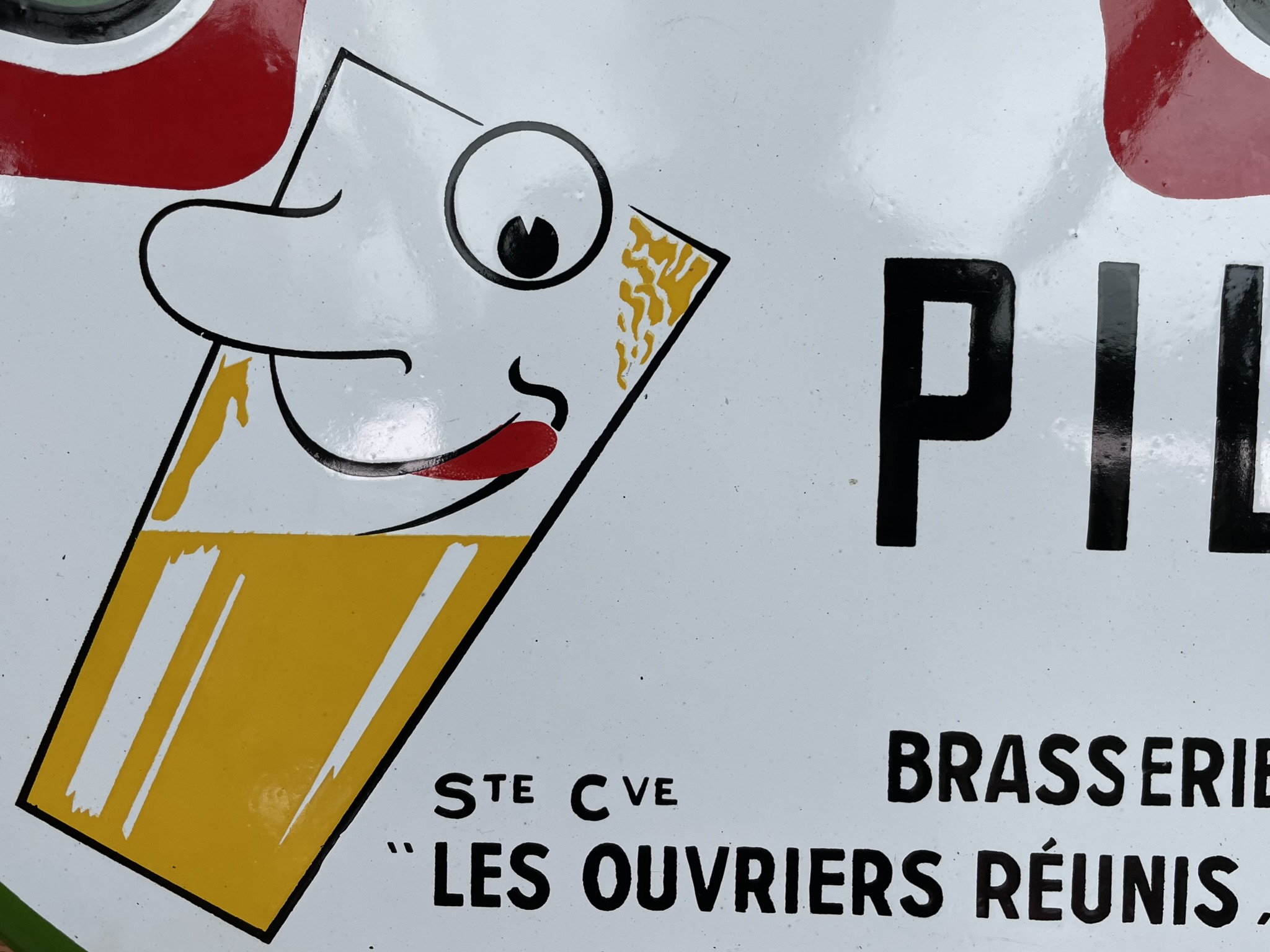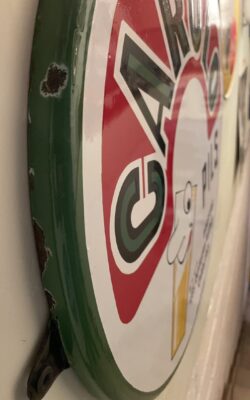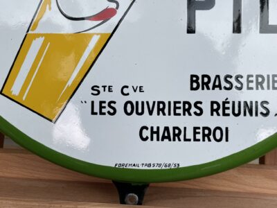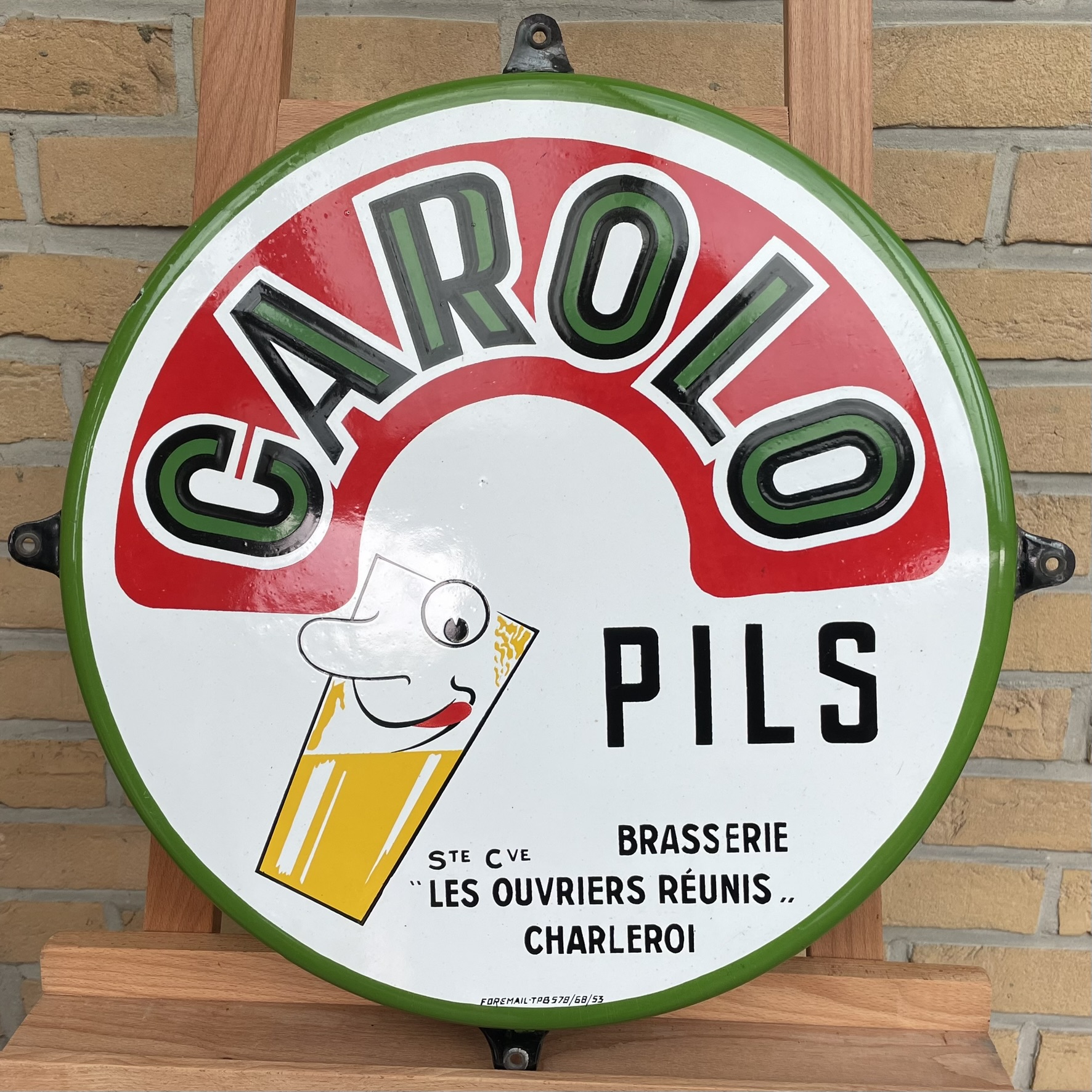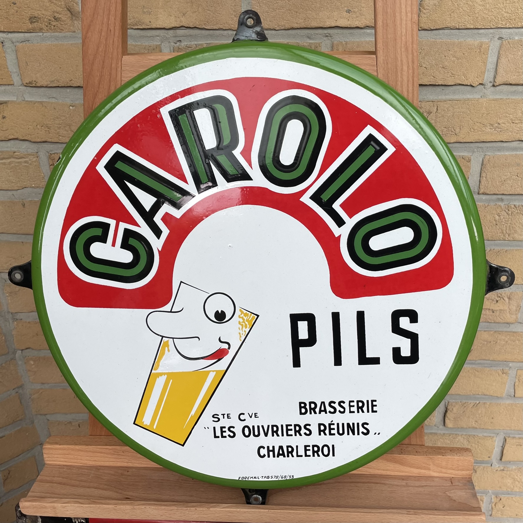 Sehr seltenes, witziges Brauereischild / Bierschild aus Belgien von 1953. Geworben wird für das Pils der Marke CAROLO aus Charleroi. Carolo ist übrigens der Spitzname der Bewohner dieser Stadt.