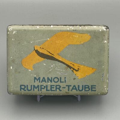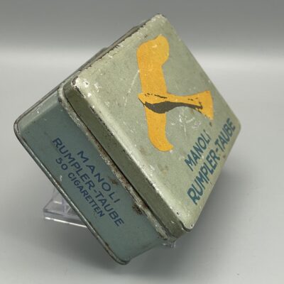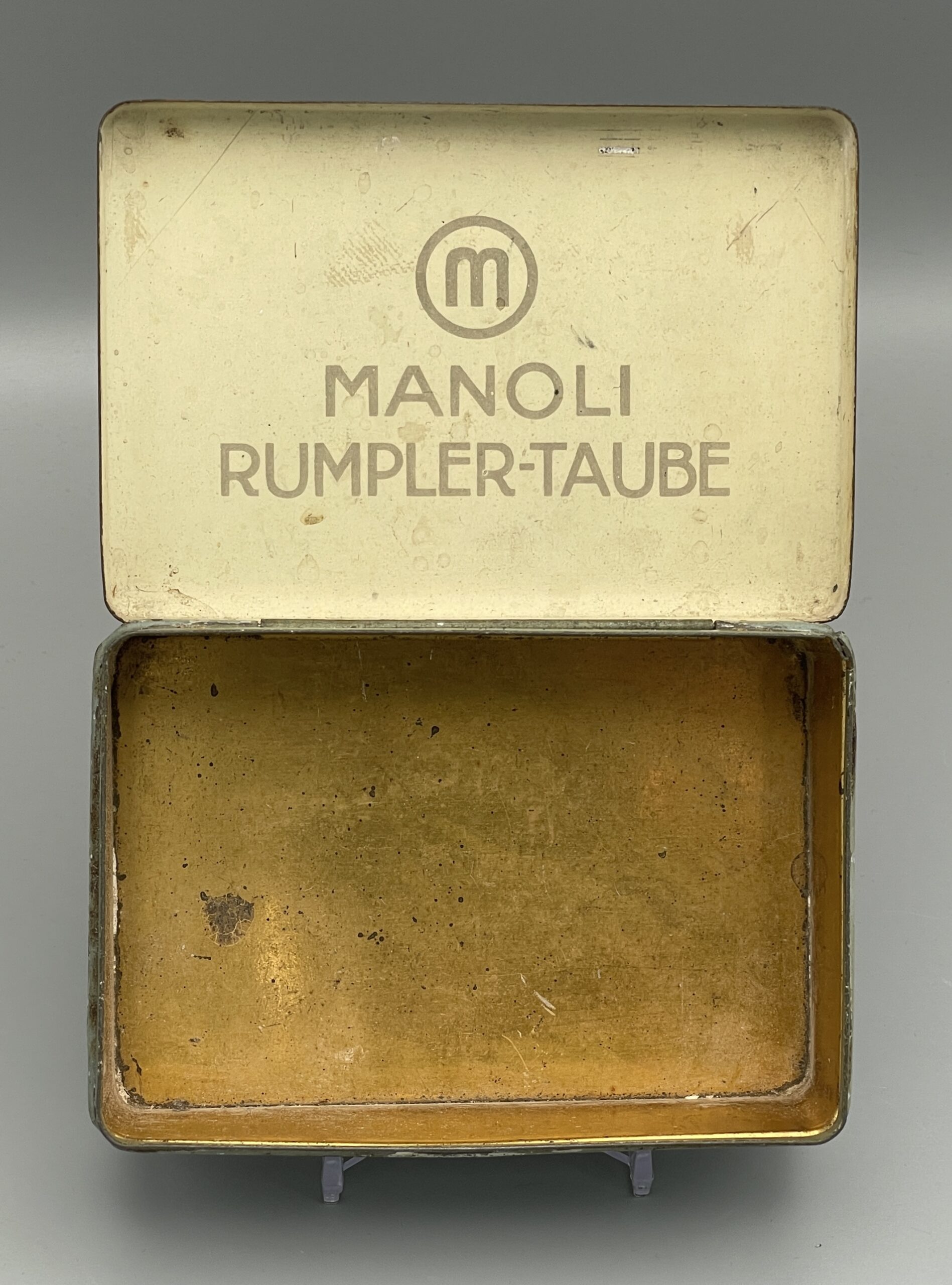 Manoli Rumpler-Taube, alte Blech-Zigarettendose um 1915, Dimensionen ca. 10 x 7 x 1,5 cm. Sammelwürdiger Zustand mit Gebrauchs- und Altersspuren, siehe Bilder.