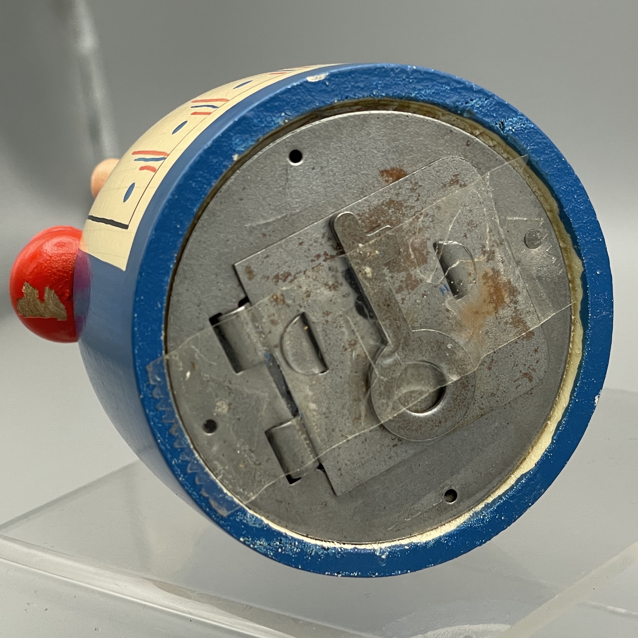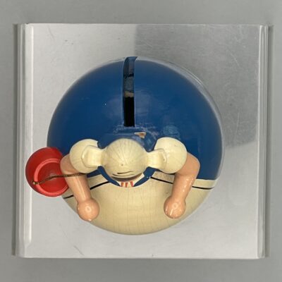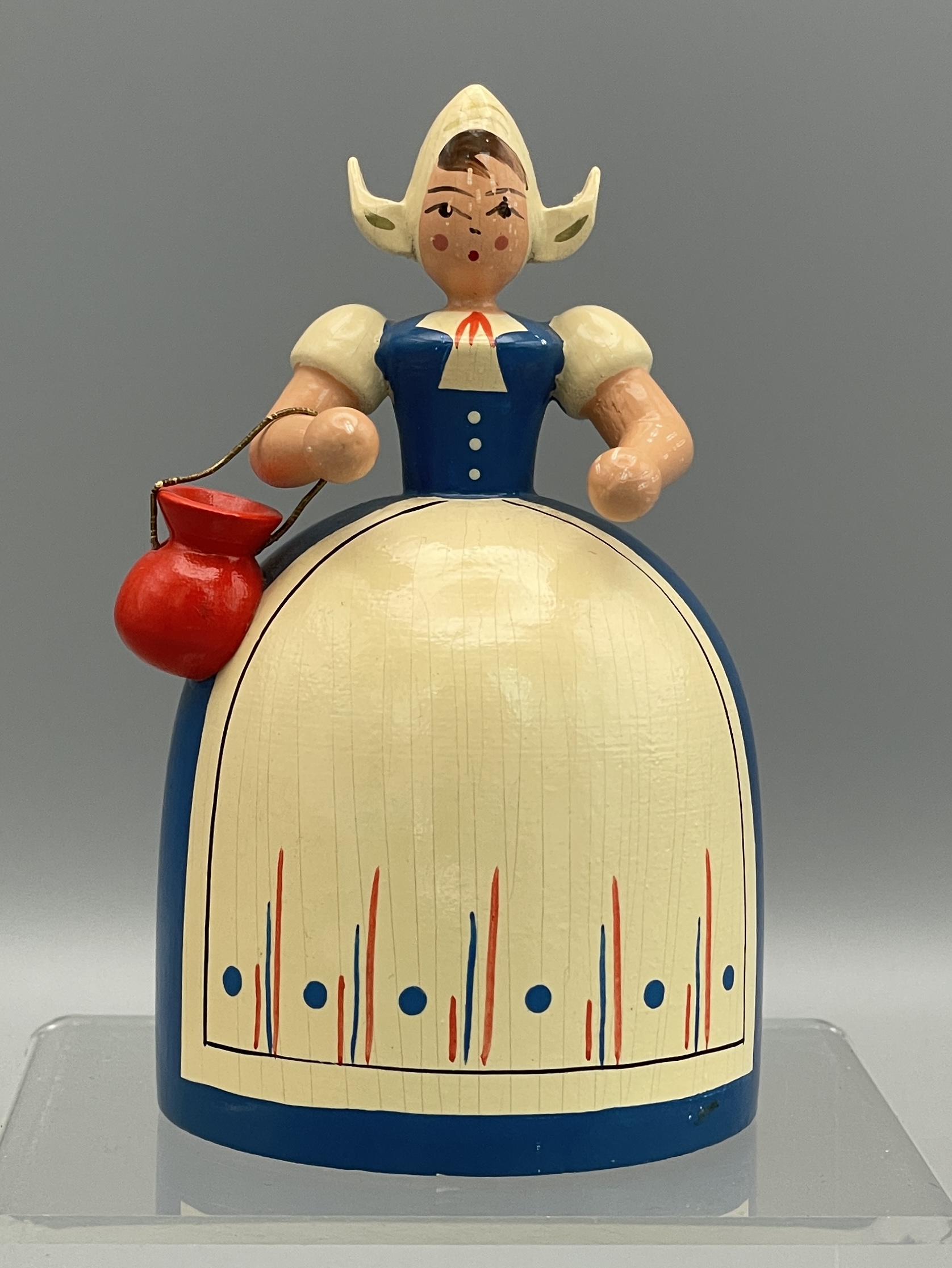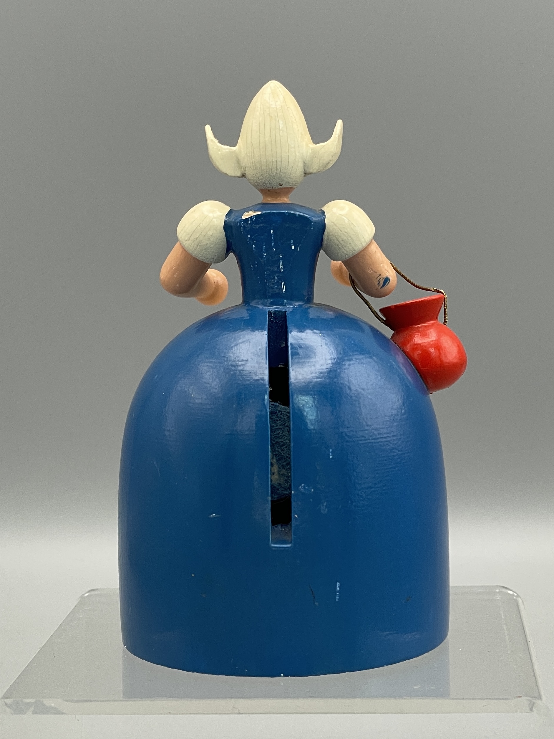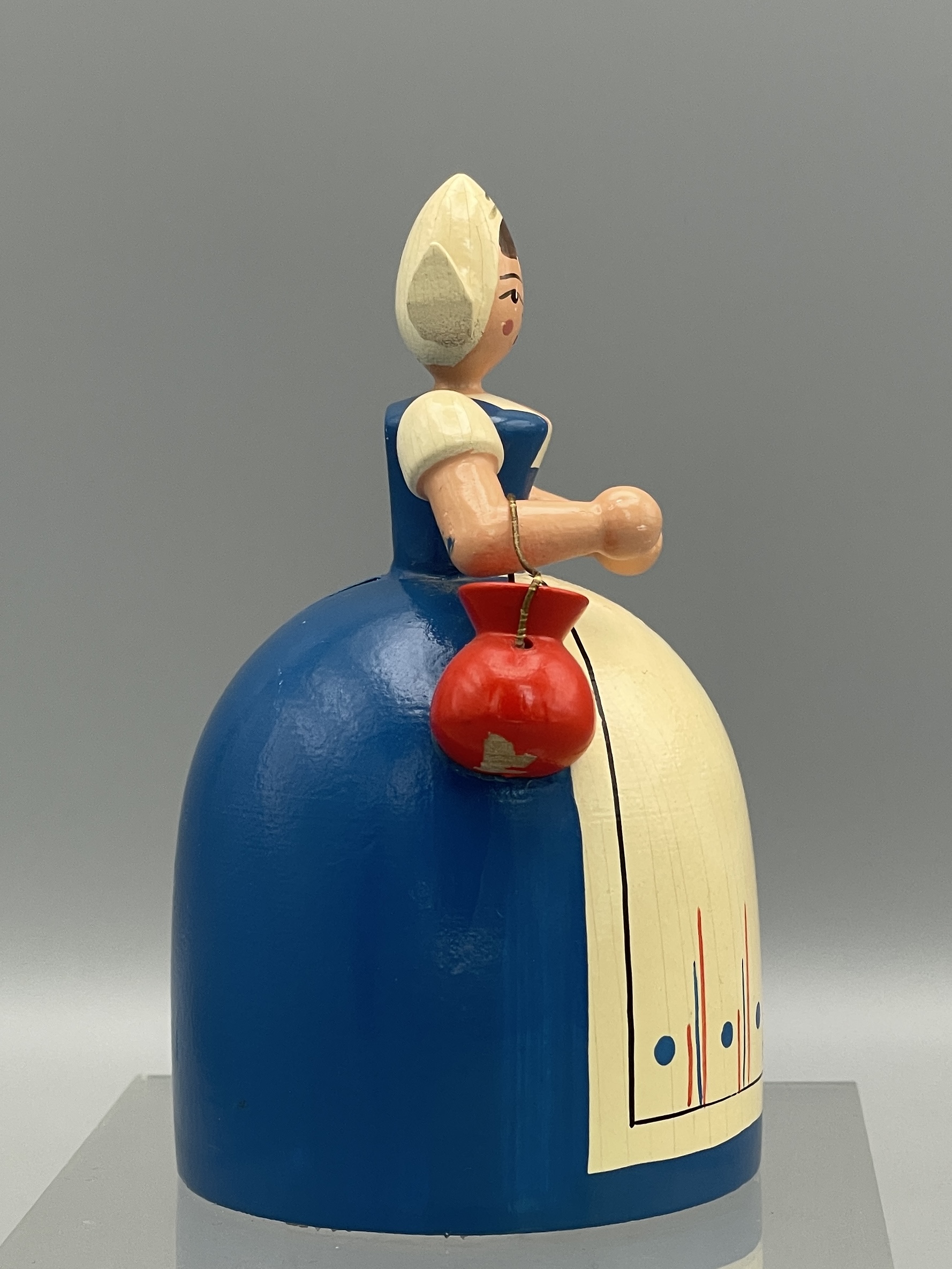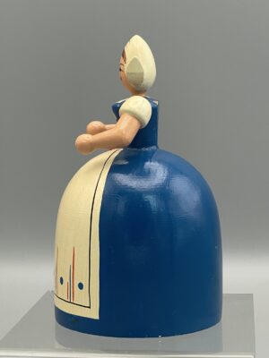 Erzgebirge-Spardose von VEB Holzwaren Gahlenz “Holländerin”. Um 1960. Abplatzer an linker Schulter und unter der Geldbörse, kleinere Altersspuren. Höhe ca. 9,5 cm, Durchmesser unten ca. 5,5 cm. Komplett mit Schlüssel! Siehe Bilder.