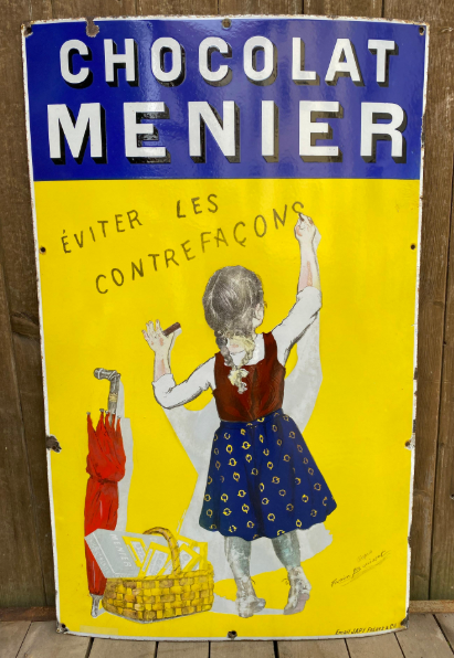 Er setzte seine eigene Tochter Yvonne als Modell ein und entwarf das Bild eines Mädchens, das mit einem Stück Schokolade auf eine Wand schreibt “Éviter les contrefaçons”, was soviel heißt wie “Fälschungen vermeiden”. Darüber in blauem Feld der Markenname “Chocolat Menier”.