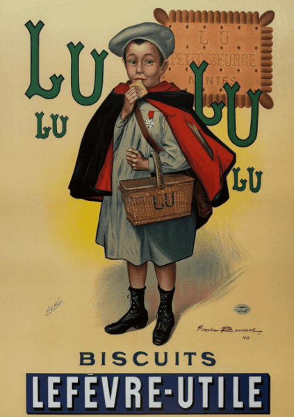 1897 schuf Bouisset für die Biscuitmarke LU (Lefévre-Utile) das Bild eines kleinen Schuljungen mit einem Korb voller Kekse. Diese einfache, natürliche Darstellung wurde zur Ikone der Marke und ist bis heute eng mit LU verbunden.