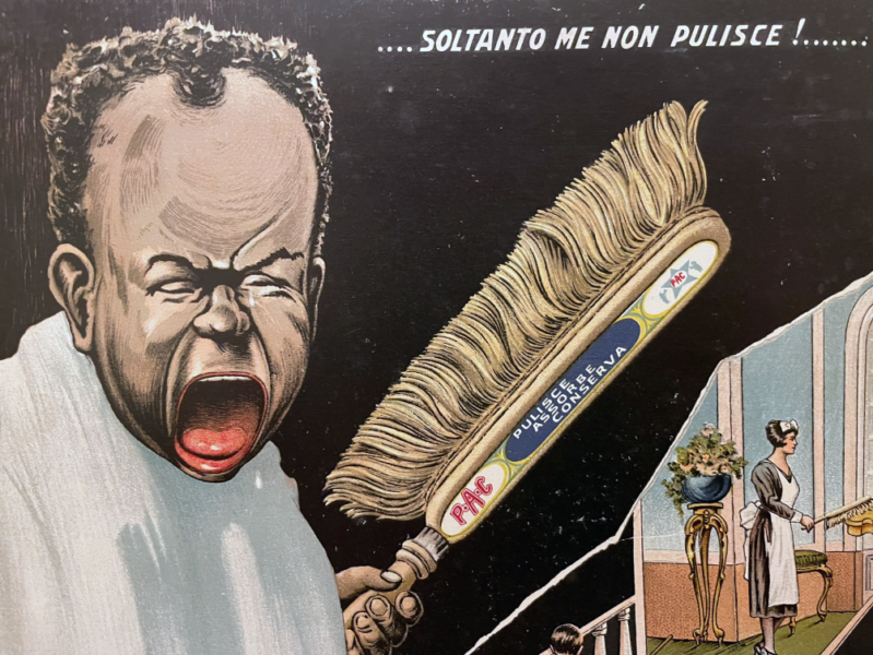 Die Bürste heißt wohl offiziell „Spazzola-Assorbi Polvere“. Sie reinigt, sie absorbiert, sie konserviert, so verspricht es der Text. Möbel, Automobile, Treppenhäuser, ganze Lebenswelten sollen unter ihren Borsten aufleuchten. Und während rechts im Bild eine Haushälterin Möbel abstaubt, eine weitere die Treppen reinigt und ein Chauffeur ein Fahrzeug pflegt, scheint links der personifizierte Widerstand selbst aufzuschreien.
