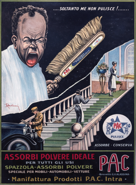 Ein Reklameplakat aus Italien, entstanden um 1930, steht im Mittelpunkt unserer heutigen Geschichte. Ein Blatt, das mit einem Augenzwinkern und erstaunlicher Wucht für ein Produkt wirbt, das auf den ersten Blick unspektakulär scheint: eine Staub aufnehmende Bürste. Die „Manifattura Prodotti P.A.C.“ in Intra, einem industriell geprägten Ort am Lago Maggiore hat sie hergestellt.
