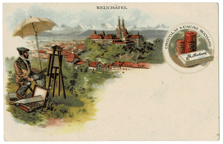 Die Werbung spielte schon früh eine zentrale Rolle im Erfolg der Marke. Zu einer Zeit, als moderne Medien wie Radio oder Fernsehen noch nicht existierten, waren Plakate, Postkarten und Schilder das wichtigste Mittel zur Werbung. Suchard setzte früh auf kunstvoll gestaltete Werbematerialien, um seine Schokolade in den Köpfen der Menschen zu verankern.