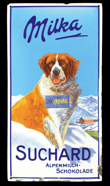 Die Schilder waren nicht nur robust und wetterbeständig, sondern auch künstlerisch gestaltet und oftmals bunt, um die Aufmerksamkeit der Passanten auf sich zu ziehen, wie etwa das Emailschild, das einen Bernhardiner zeigt, der statt des bekannten kleinen Fasses Hochprozentiges eine Tafel Milka umgebunden hat.