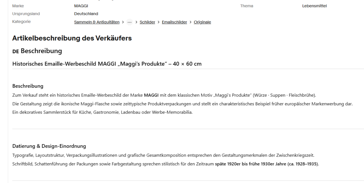 Das angebotene Maggi-Schild kommt mit einer vermutlich KI-generierten Beschreibung daher, so wie das auch schon der Fall beim Anbieter u.a. des Muskator– und des Göricke-Schildes den Anschein hatte.