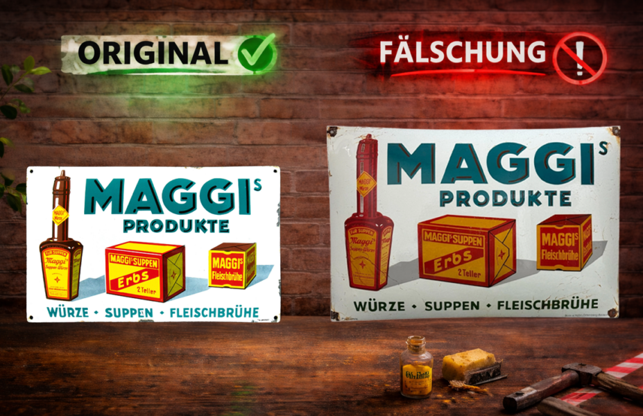 Das Maggis Produkte, im Original aus der Zeit um 1920, taucht seit einiger Zeit vermehrt als Fälschung auf Floh- und Trödlermärkten, sowie im Internet auf den bekannten Plattformen auf.