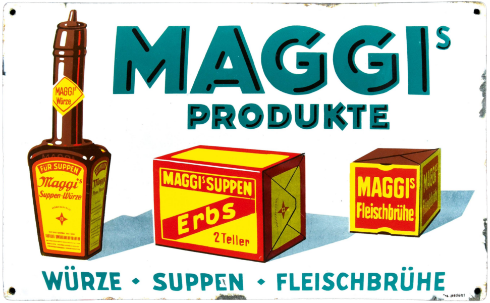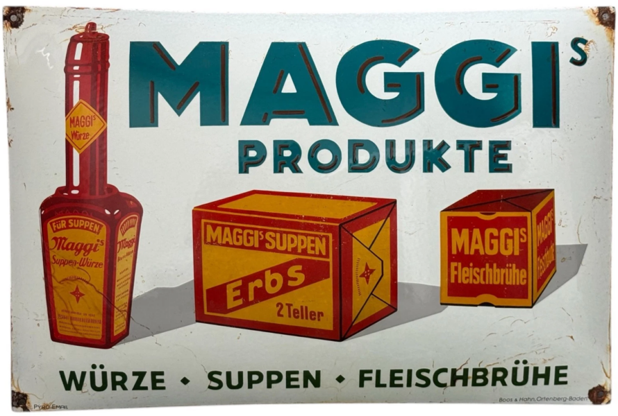 - Da Maggi alle Schilder in Eigenregie produzieren ließ, findet man keine Emaillierwerksangabe, lediglich die Markierung “Ges. geschützt” am rechten unteren Rand.