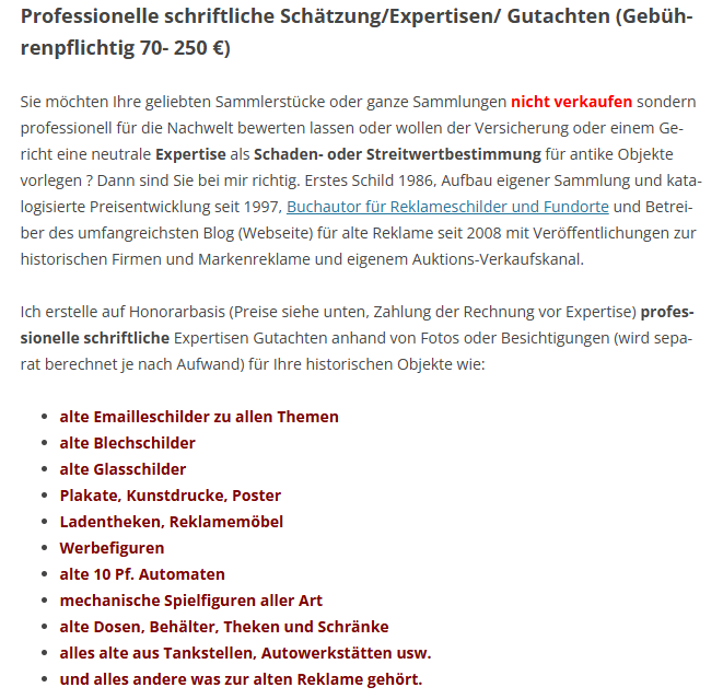 Eine klare fachliche Einordnung als Sachverständiger für historische Reklame oder Emailschilder ist daraus nicht ersichtlich. Gleichzeitig bleibt damit offen, in welcher Rolle die angebotenen Gutachten eigentlich erstellt werden: als gewerbliche Dienstleistung, als freiberufliche Tätigkeit oder als private Beratung?
