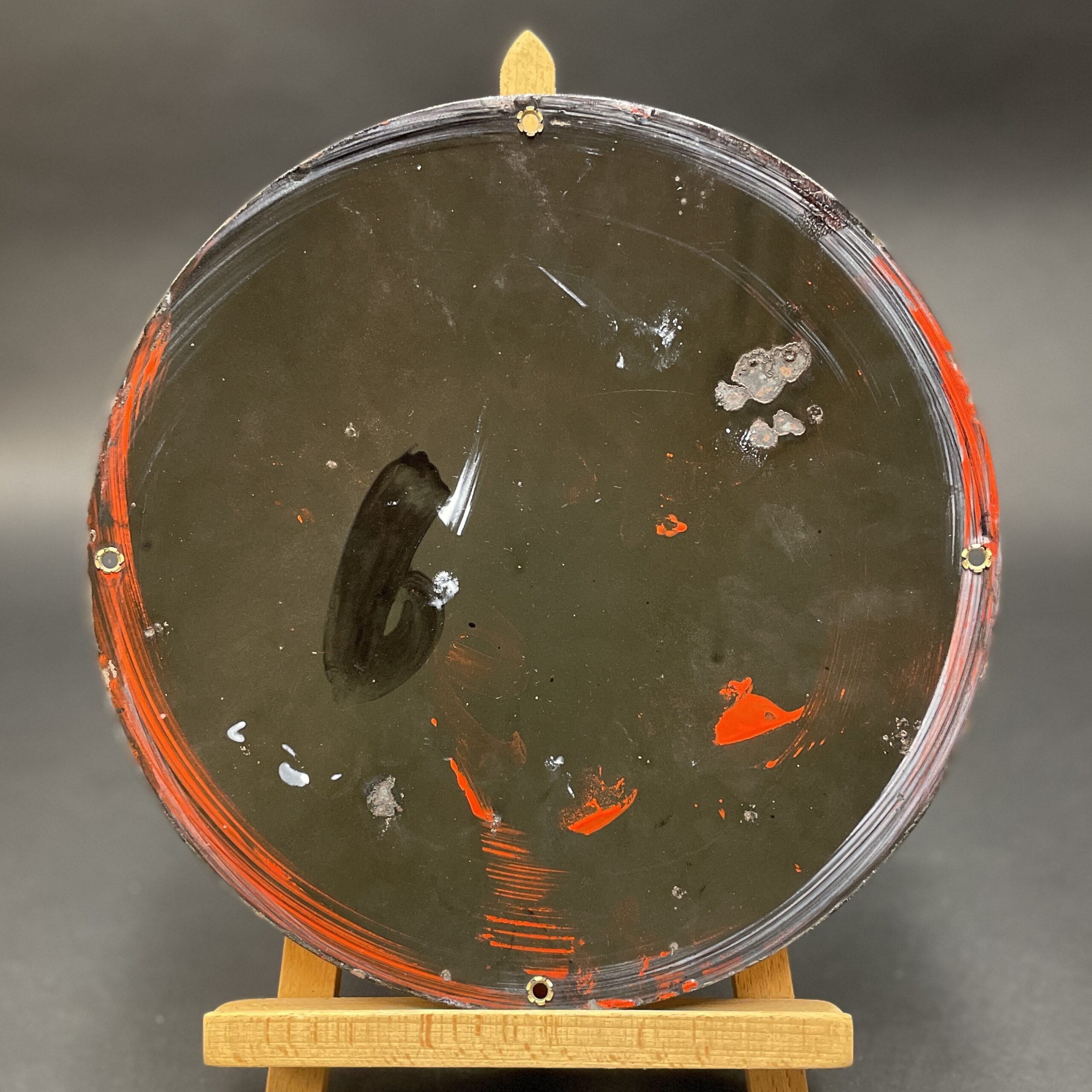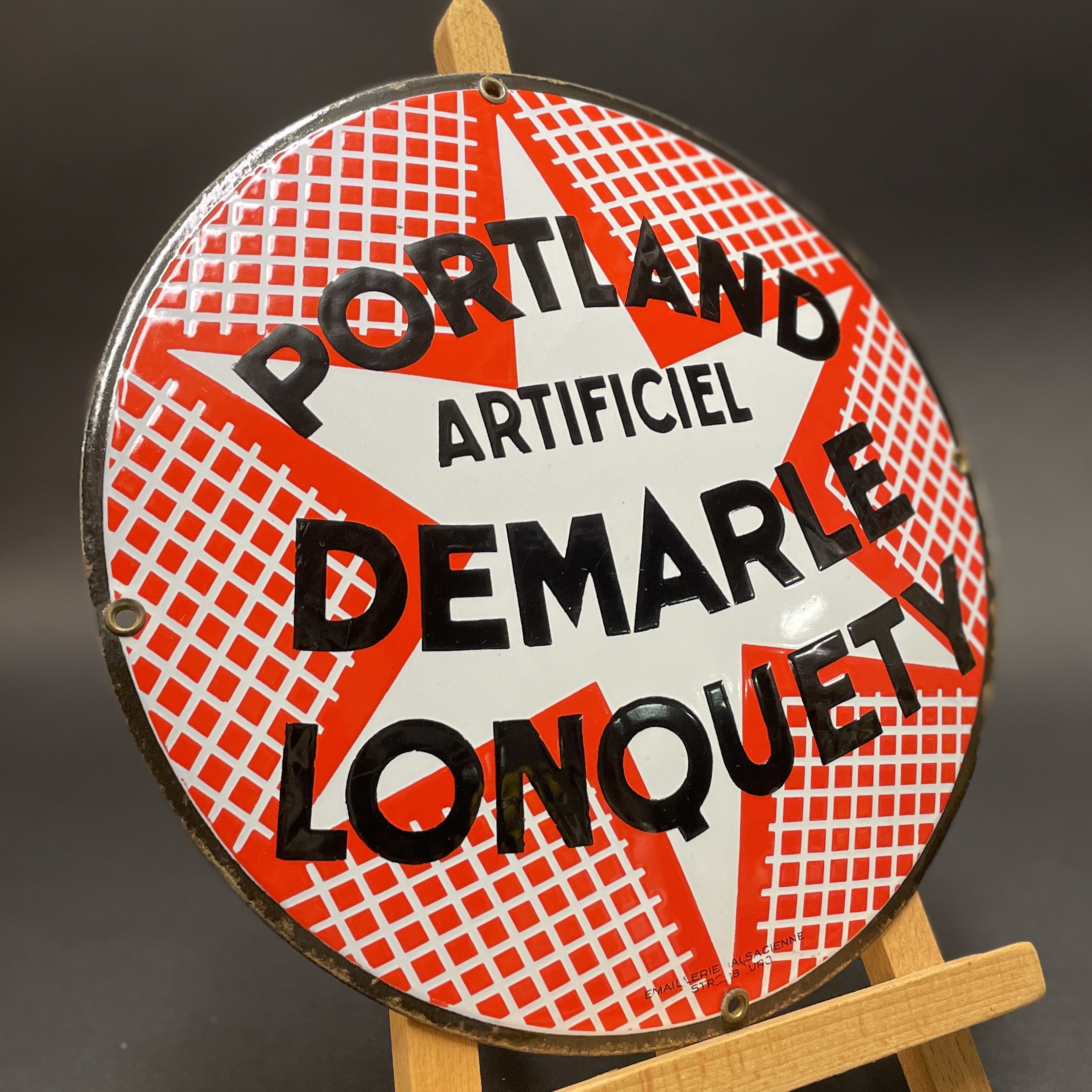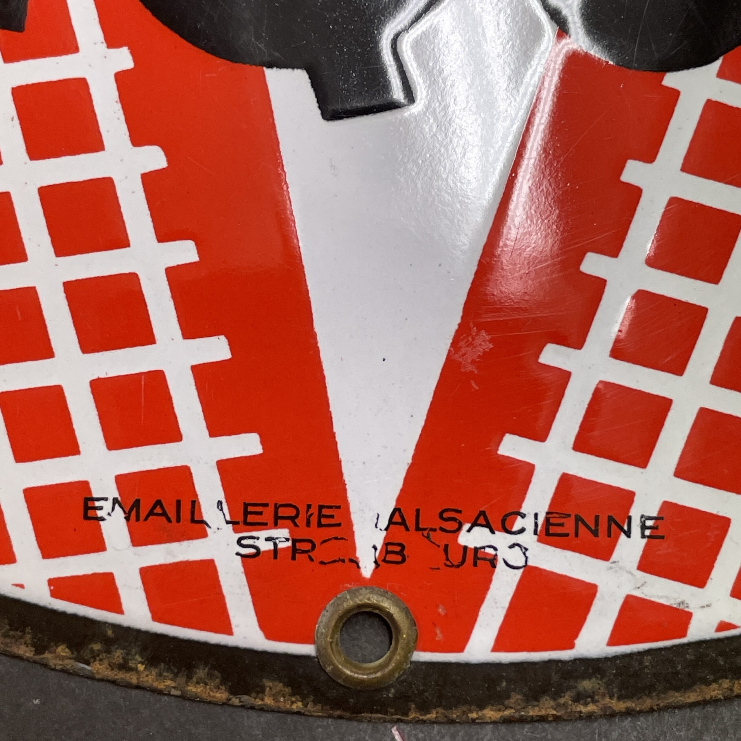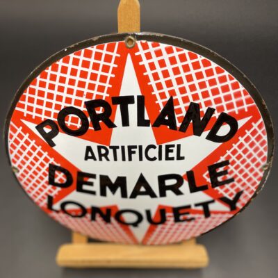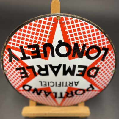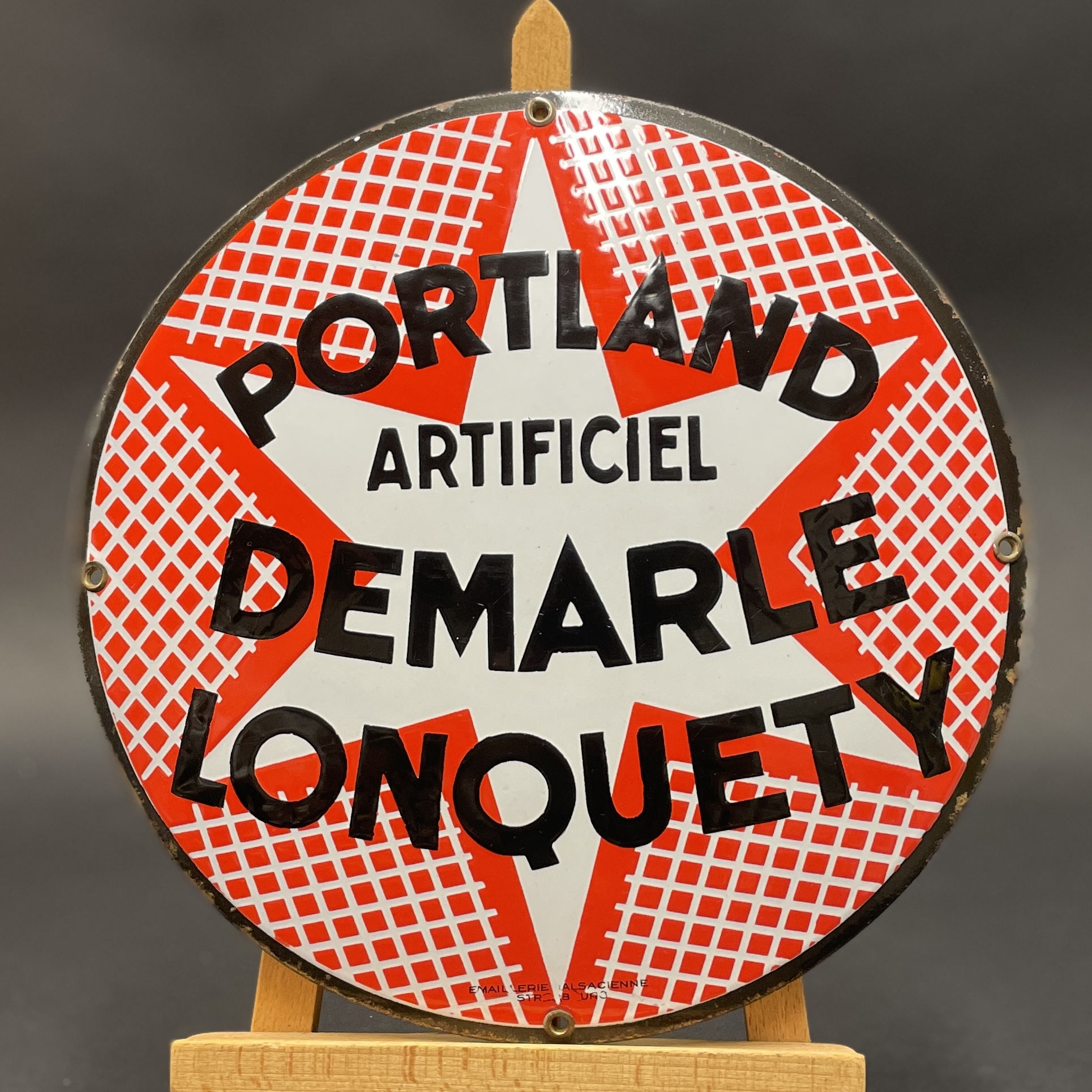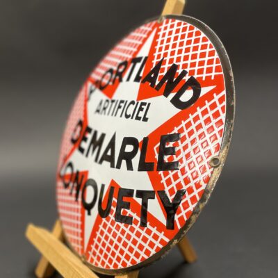 Zement wird mit diesem grafisch interessanten Emailschild aus Frankreich beworben. Der Durchmesser beträgt 29,5 cm, das fett schablonierte Schild ist gewölbt und in einem sehr guten Zustand mit schönem Glanz!