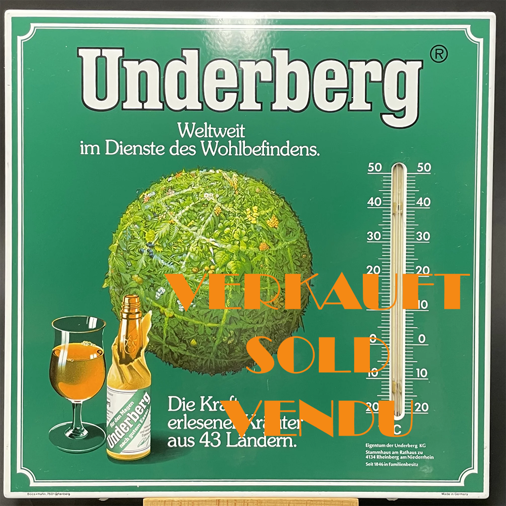 Schweres emailliertes Reklameschild von UNDERBERG aus der Zeit um 1975/85. Abgekantet, dickes Trägermaterial. Das Emailschild befindet sich in einem sehr guten Zustand, das Thermometer ist original und funktioniert. Dimensionen: 47 x 47 cm.