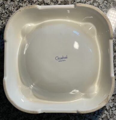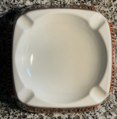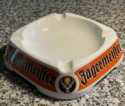 Großer Stammtisch-Aschenteller mit Reklame für Jägermeister, hergestellt in den 1960er Jahren bei Goebel. Der Zustand ist gut, an der Unterseite ein größerer und ein kleinerer Chip, die von oben nicht auffallen. Kantenlänge ca. 20 cm, Höhe ca. 5 cm.