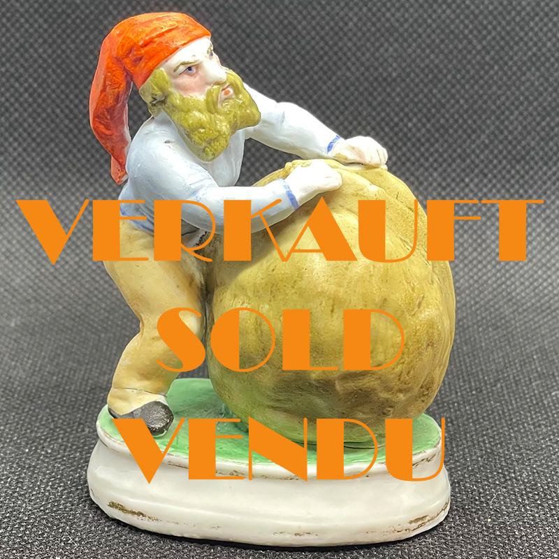 Obwohl diese Spardose nur ganze 10 Zentimeter hoch ist, beeindruckt sie doch. Die feine Malerei, der Gesichtsausdruck des Zwergen, … Faszinierend, diese antiken Sparbüchsen. Deutschland, um 1900. Abrieb am unteren Goldrand, ansonsten Top-Zustand. Siehe Bilder!