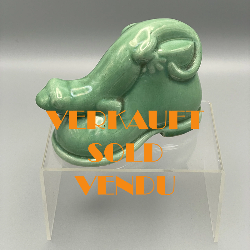 Die Spardose aus Keramik ist ca. 12,5 cm lang und 9 cm hoch. Der Zustand ist bis auf einen Chip an der Vordersohle sehr schön. Sicherlich lässt sich dieser Schaden mit etwas grünem Lack optisch beruhigen. Am Logo am Unterboden, erkennt man, dass sie da wohl mal ‘geöffnet’ wurde. Siehe Bilder!