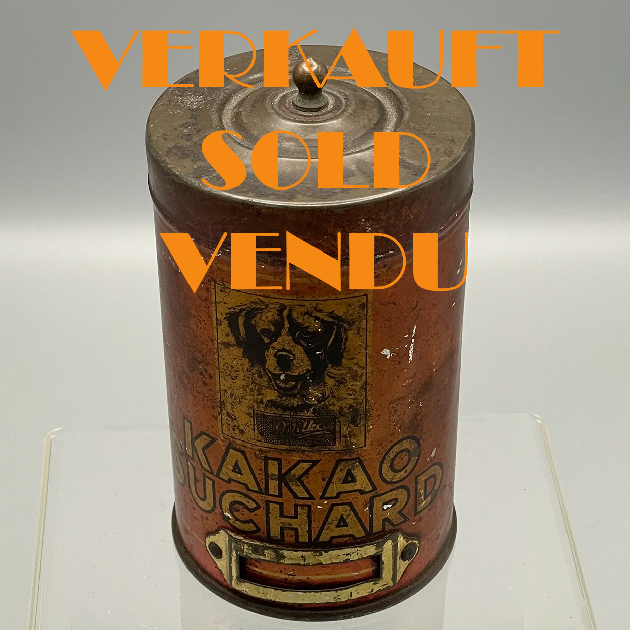 Seltene, kleine Blechdose von Kakao Suchard (100 Gramm Dose), um 1910. Darstellung des Bernhardiners um dessen Hals eine Tafel Schokolade hängt. Deckel mit winzigem Knauf. Ca. 12 cm hoch, Durchmesser 6,5 cm.