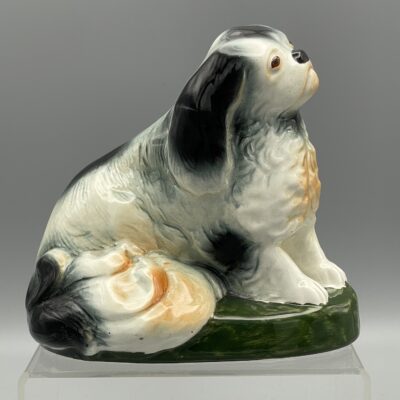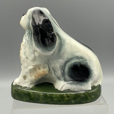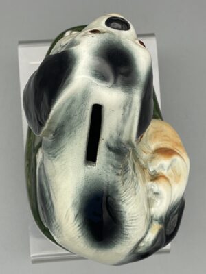 Sehr schöne und seltene Spardose aus der Fayence-Manufaktur im polnischen Chodzież, aus der Zeit zwischen 1922 und 1936, wie aus dem Bodenstempel hervorgeht. Dargestellt ist ein zugleich traurig wie hoffnungsvoll dreinblickender Kind Charles Spaniel mit polychromer Glasur.