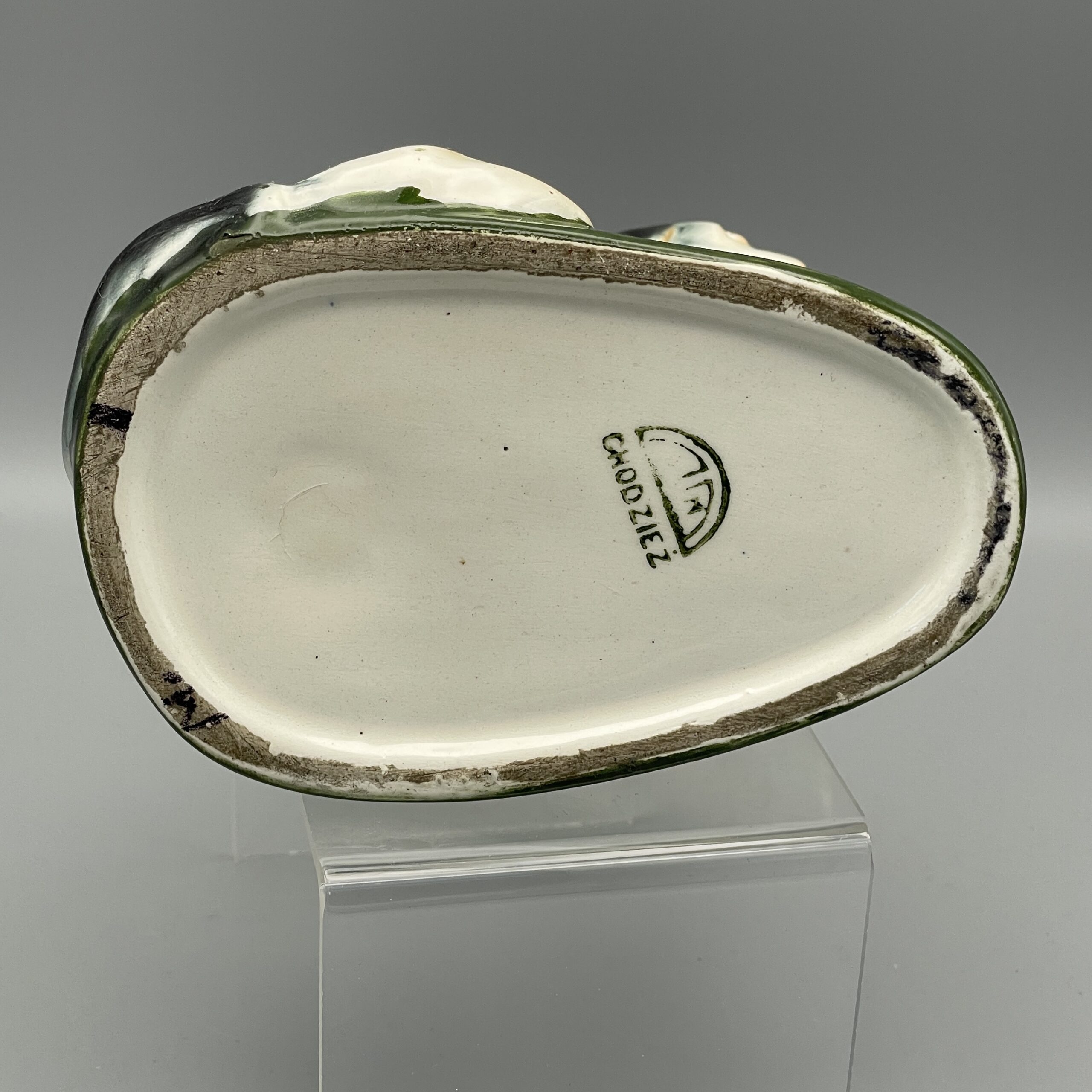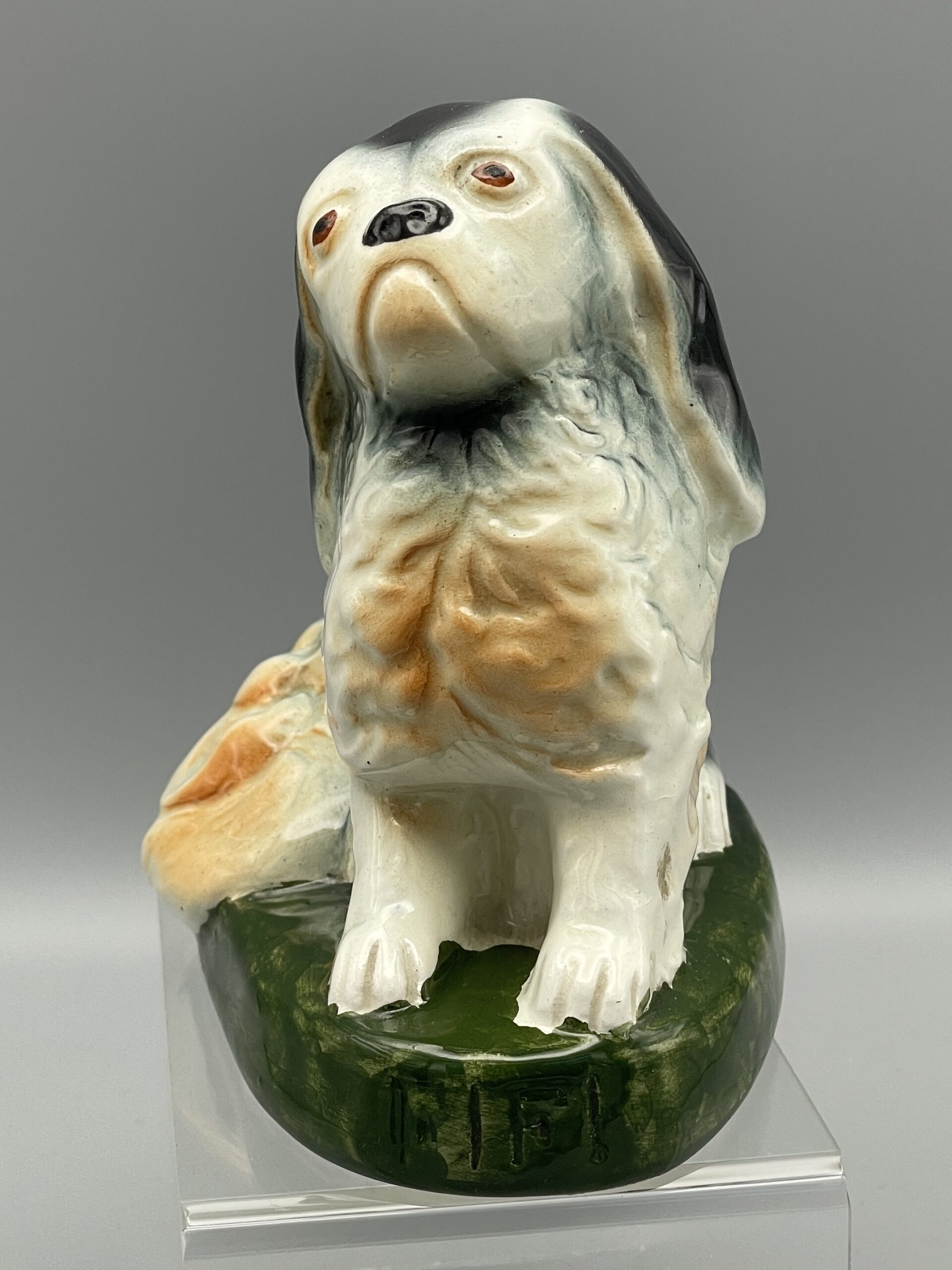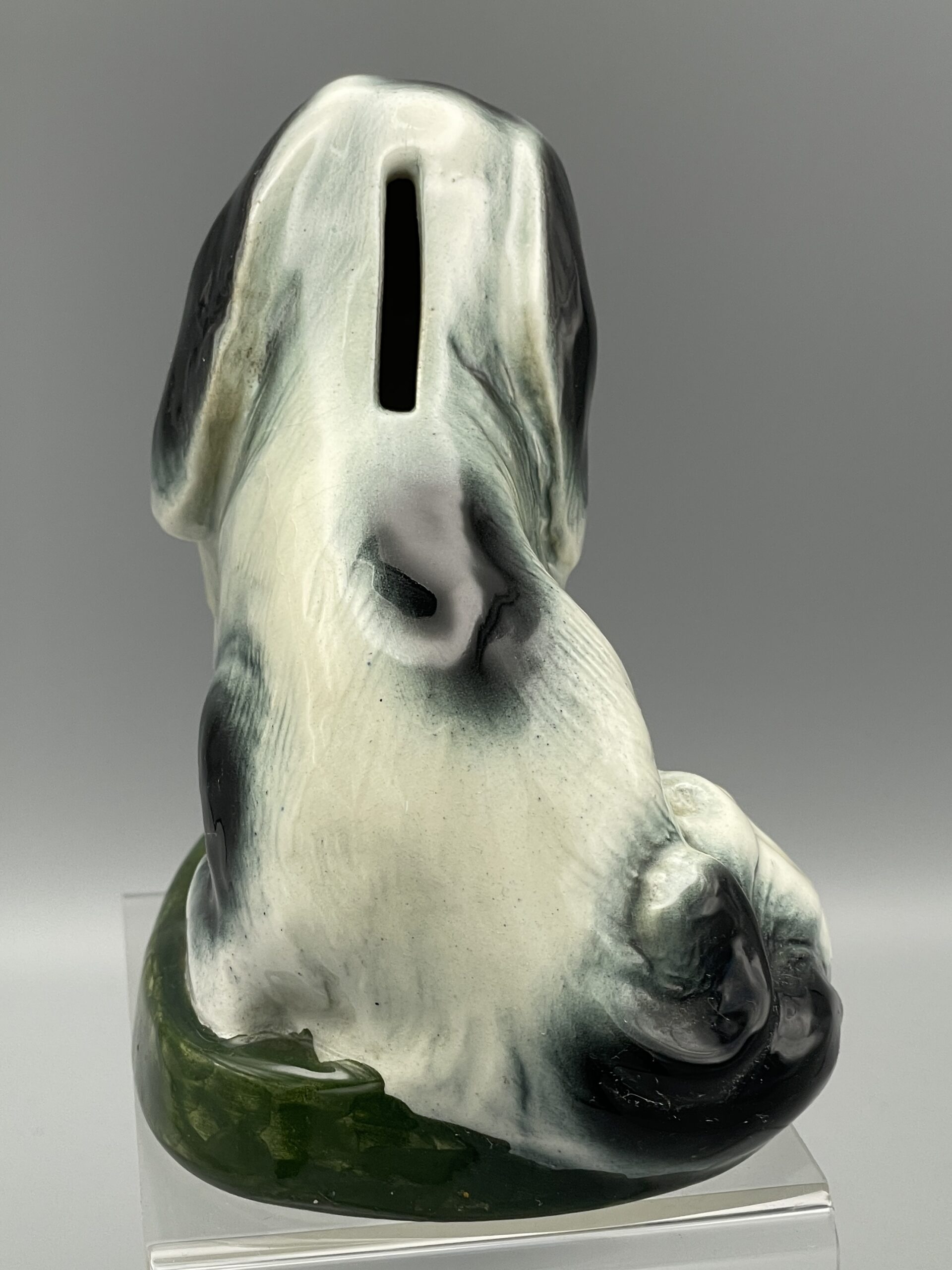 Sehr schöne und seltene Spardose aus der Fayence-Manufaktur im polnischen Chodzież, aus der Zeit zwischen 1922 und 1936, wie aus dem Bodenstempel hervorgeht. Dargestellt ist ein zugleich traurig wie hoffnungsvoll dreinblickender Kind Charles Spaniel mit polychromer Glasur.