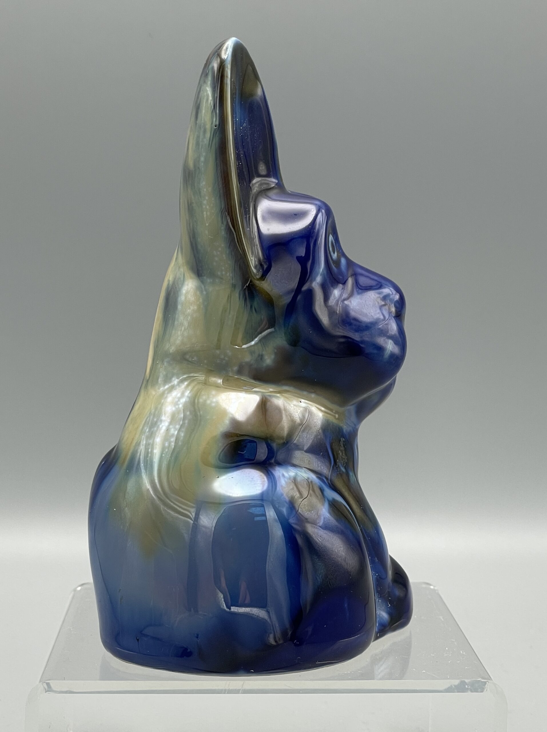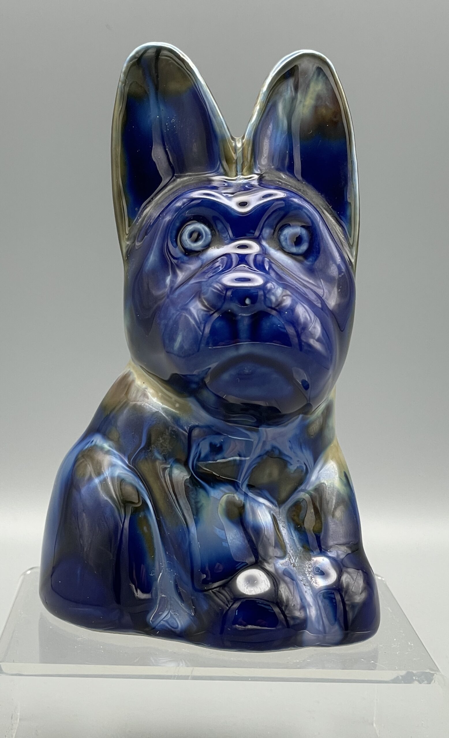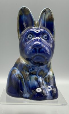 Sehr seltene Figur eines süßen, sitzenden Hundes (Mops) mit stehenden Ohren. Herrliche polychrome Glasur. Hergestellt um 1920/30 in der Keramik-Manufaktur von Emile Fourneron, Ponsas (Drôme, Frankreich).