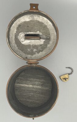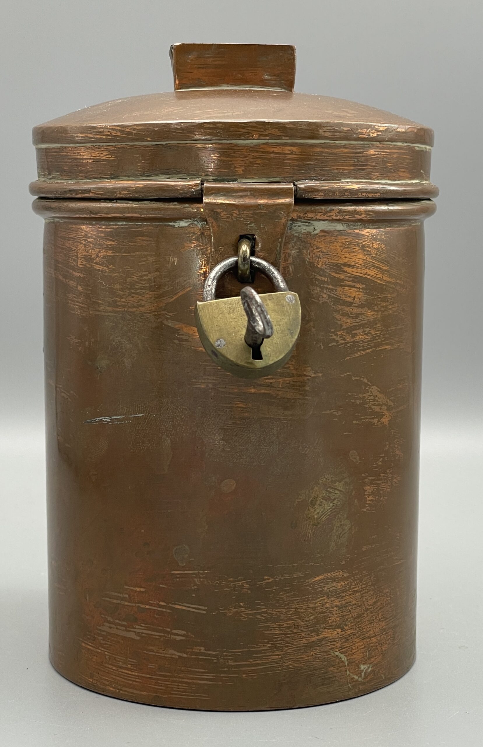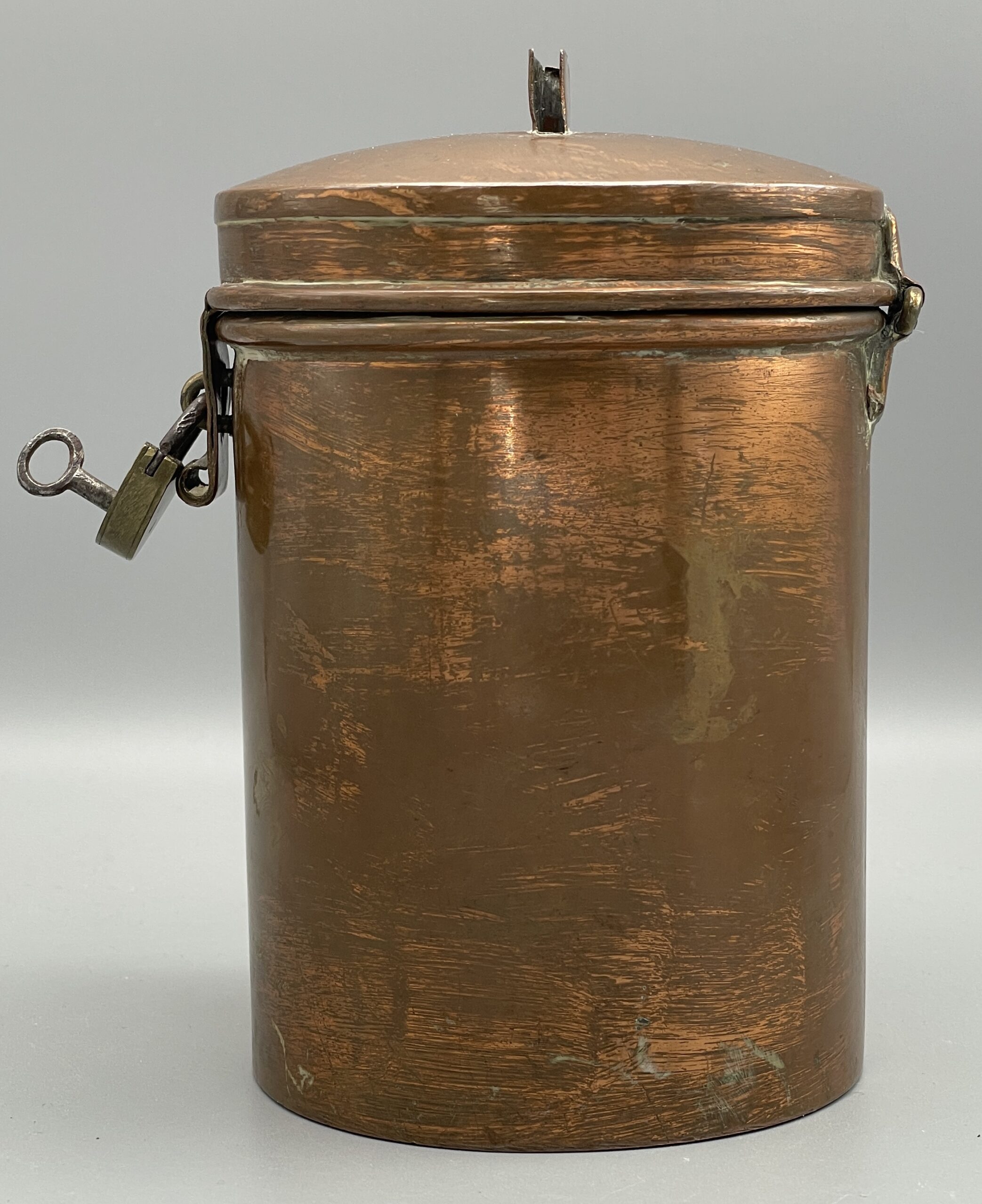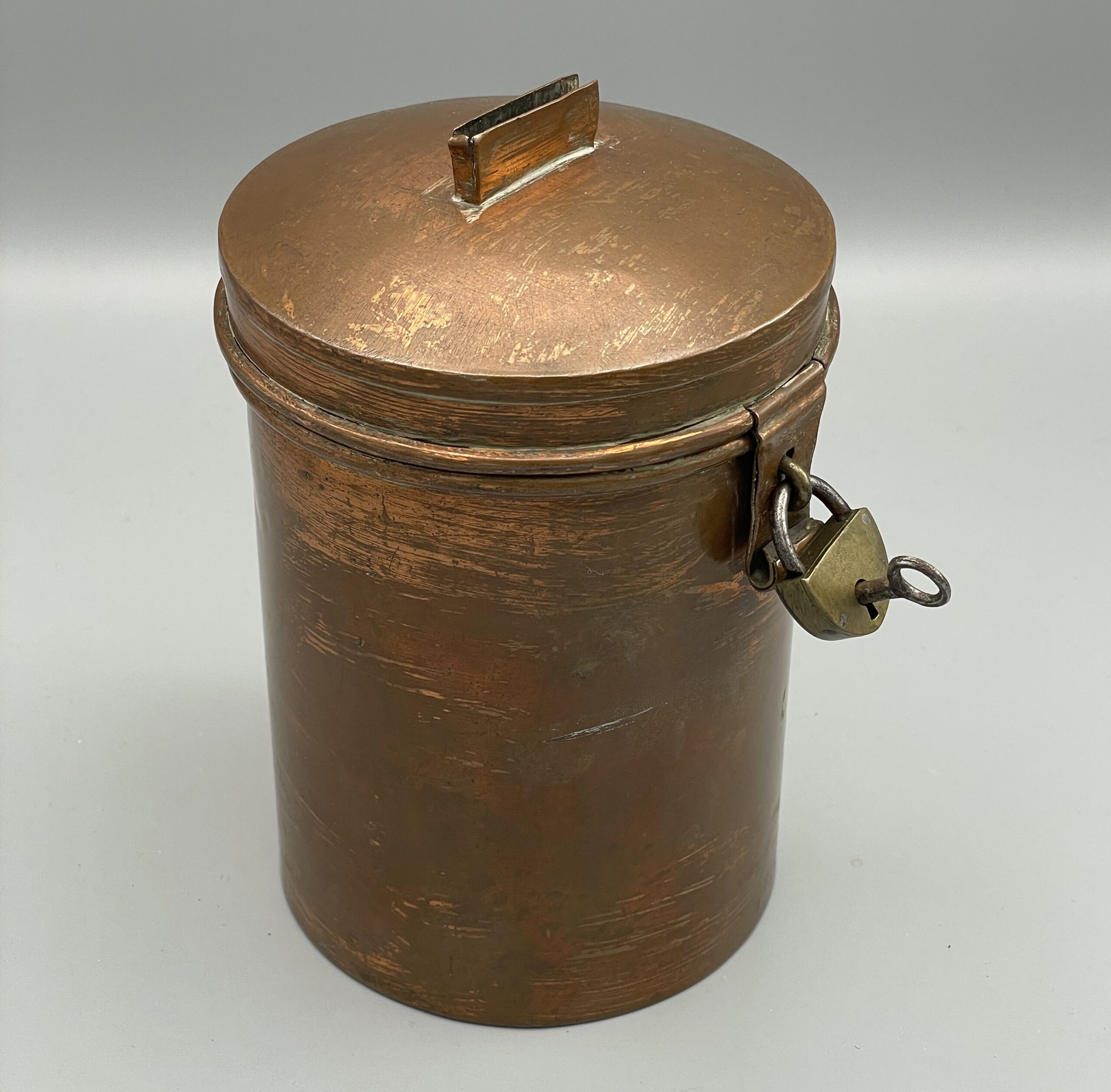 Antike Spendendose aus verkupfertem Metall, komplett mit Schloss u. Schlüssel. Ca. 15 cm hoch. Schöner Zustand, siehe Bilder!