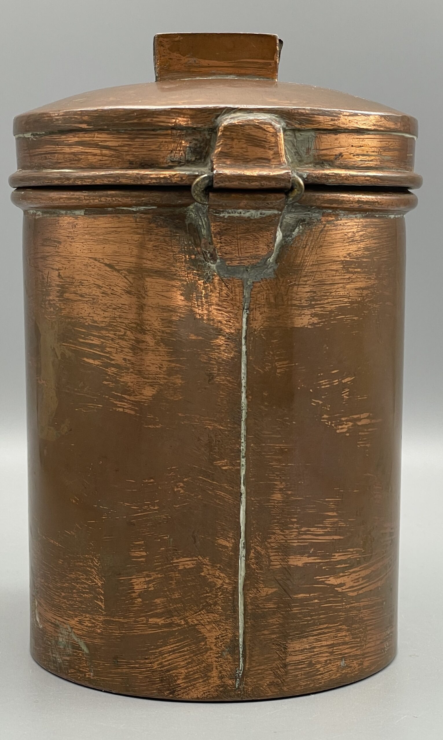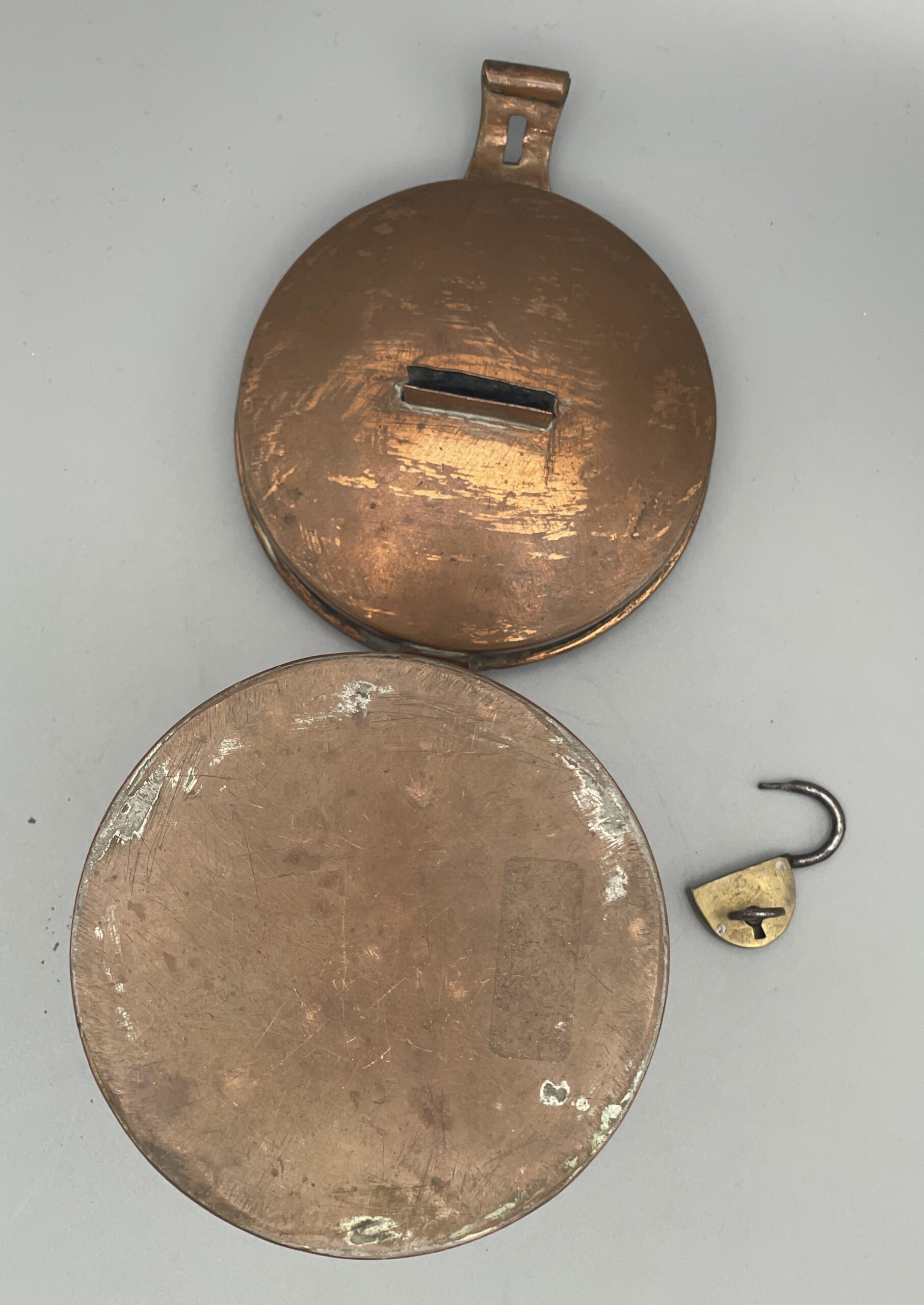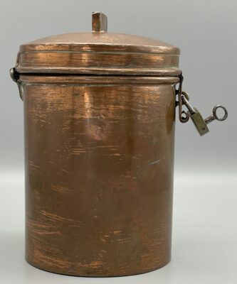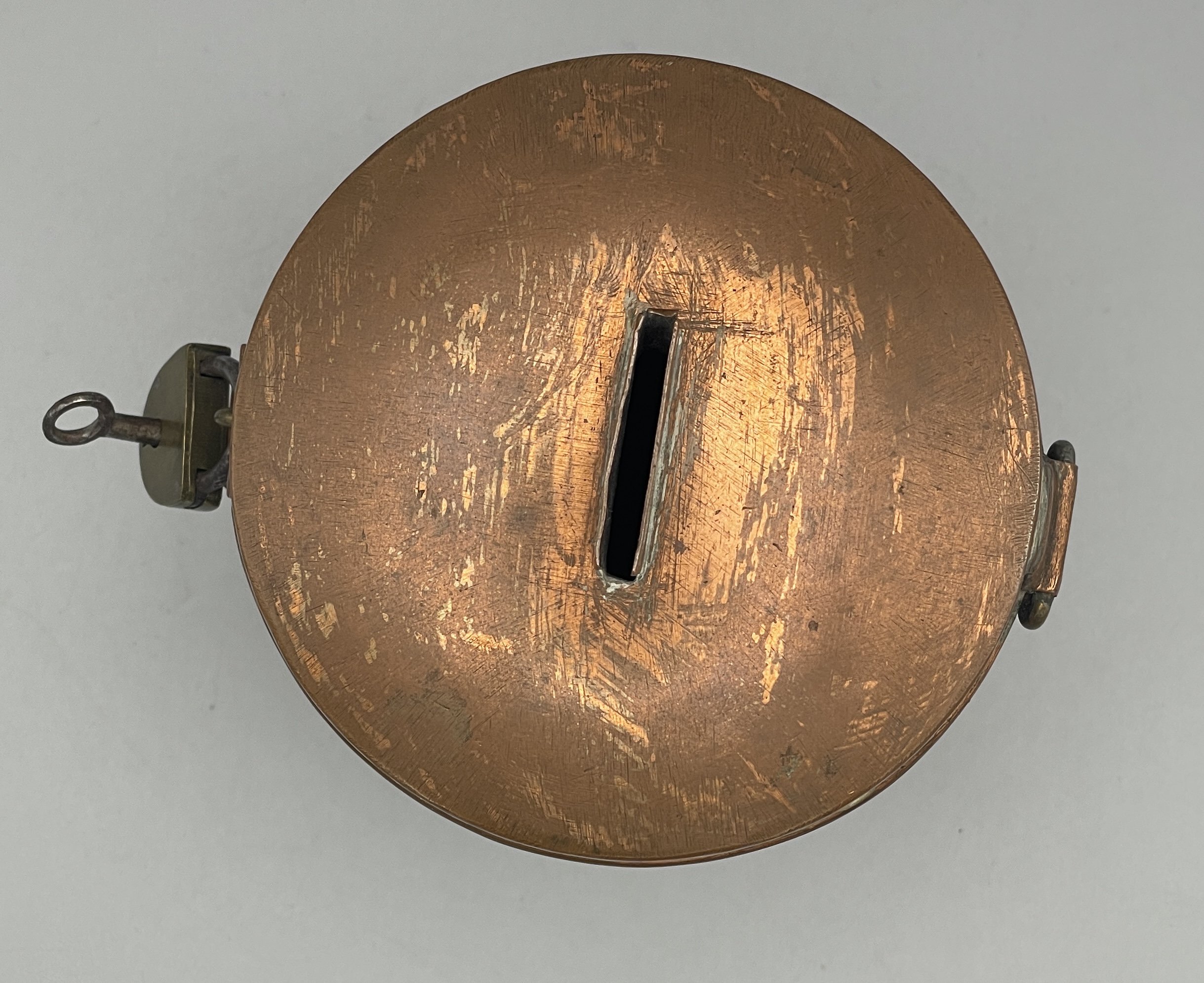 Antike Spendendose aus verkupfertem Metall, komplett mit Schloss u. Schlüssel. Ca. 15 cm hoch. Schöner Zustand, siehe Bilder!